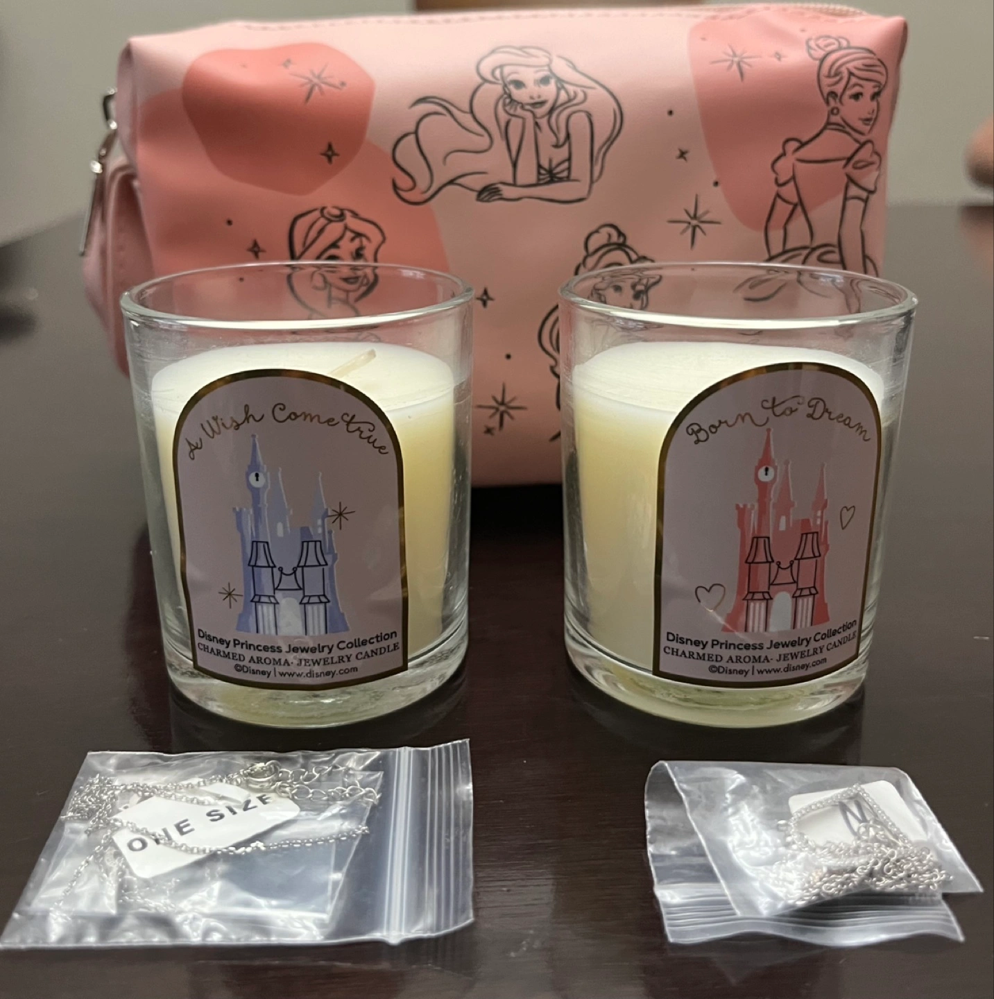 10Disney® Princess Candles + Makeup Bag Set - Disney Princess Jewelry Collection Official Licensed Disney® Product Bring home some Disney Princess magic to your daily routine with this candle and makeup bag set! Light the candle and enjoy the amazing fragrance. The makeup bag can hold all your makeup products, brushes, and accessories. The durable zipper ensures your items are secure, making it perfect for travel or daily use. Set contains: - Makeup Bag - 2 Candles (3.5oz/100g) - 2 Disney Princess Jewelry Pieces Fragrance Light the candle and enjoy a sweet strawberry, vanilla cream and tart lemon. How it Works Light your jewelry candle and enjoy the amazing, long lasting fragrance. As a bonus, reuse this candle jar as a decor piece for your home or to keep your favorite trinkets in.