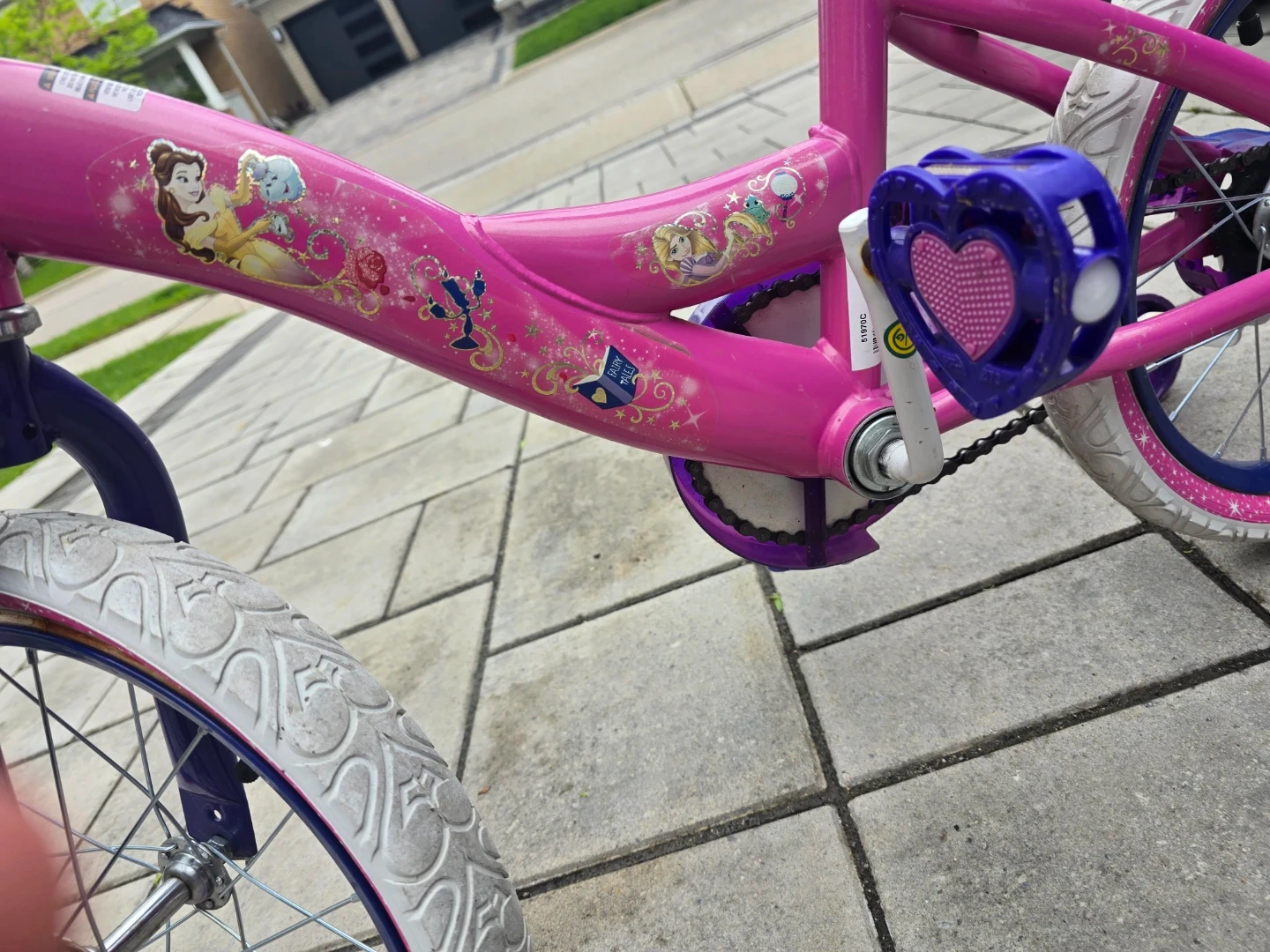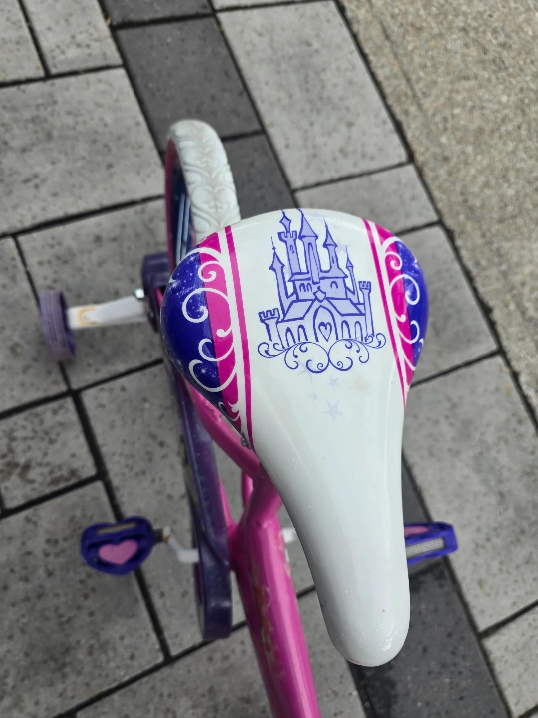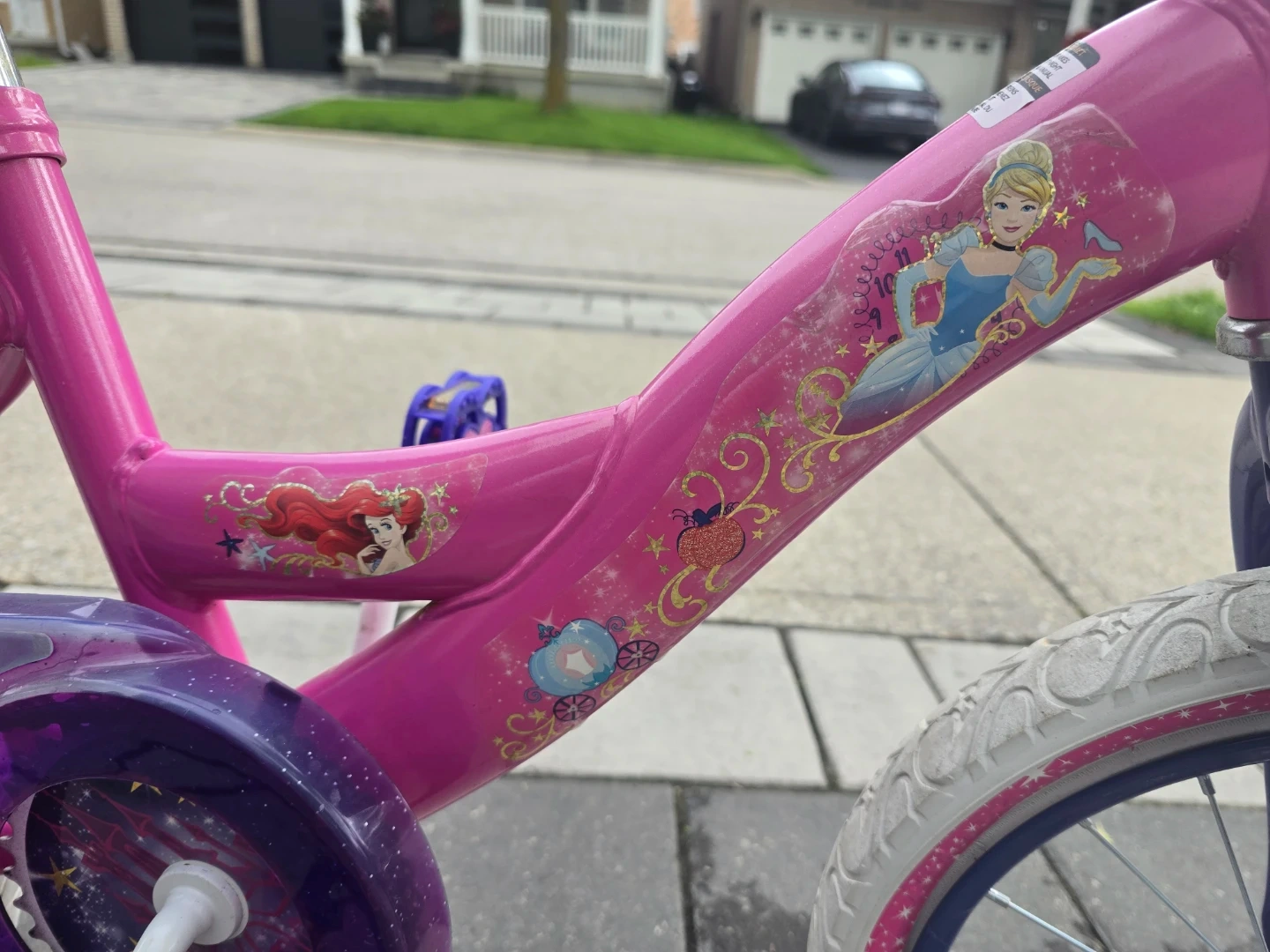 60Selling a cute Disney Princess themed bike for kids! It's pink and purple with Disney Princess characters like Belle, Cinderella, Ariel, and Jasmine. Perfect for a little one who loves Disney!