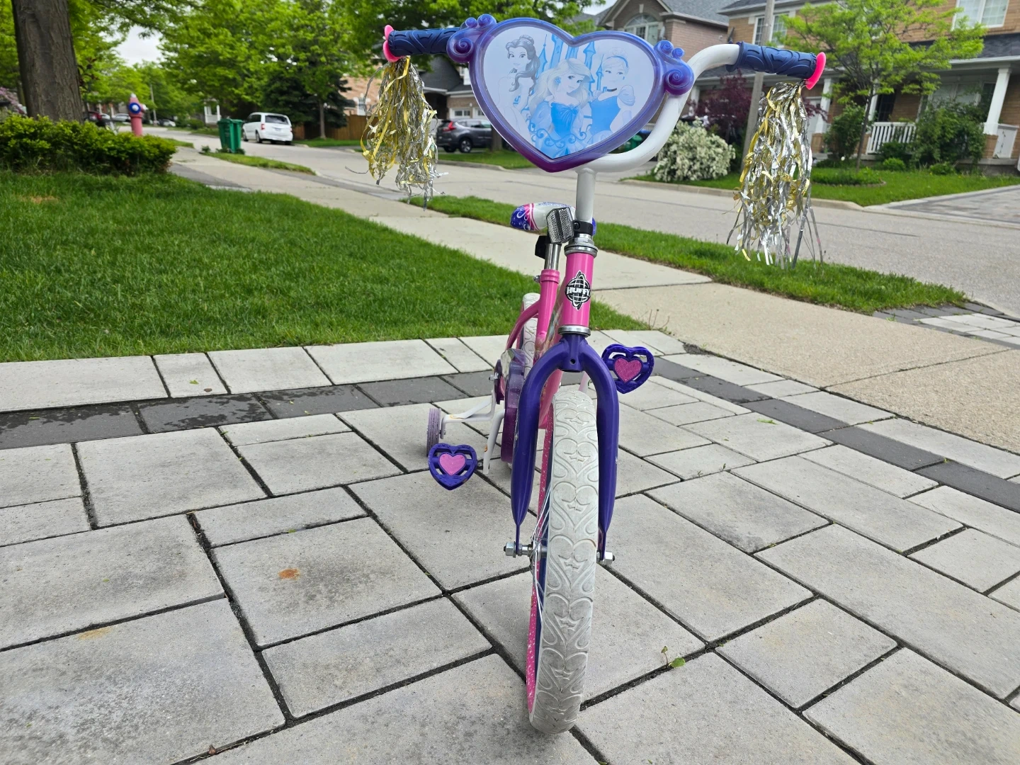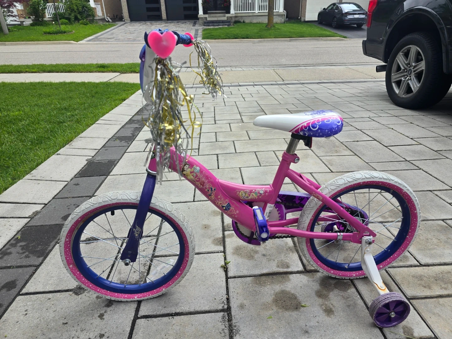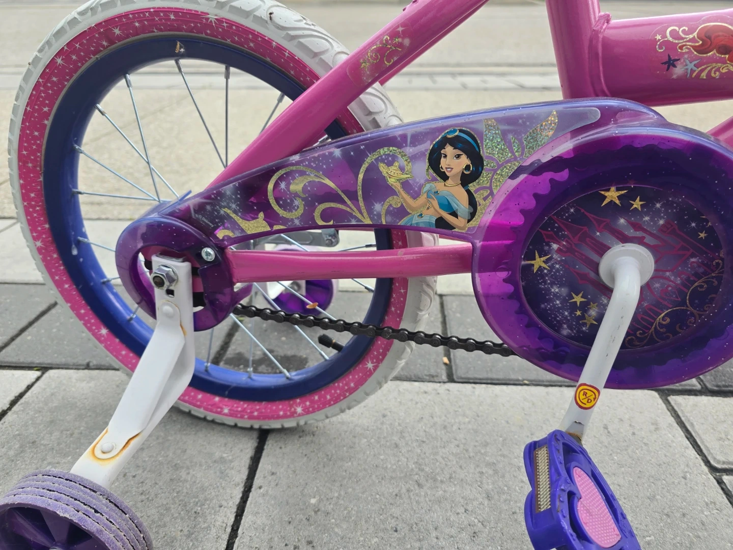 60Selling a cute Disney Princess themed bike for kids! It's pink and purple with Disney Princess characters like Belle, Cinderella, Ariel, and Jasmine. Perfect for a little one who loves Disney!
