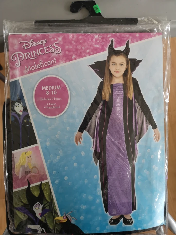 10Selling, wrone once Disney Princess Maleficent costume! This is a size medium (8-10) and includes two pieces: a dress and a headband. Perfect for Halloween or dress-up!