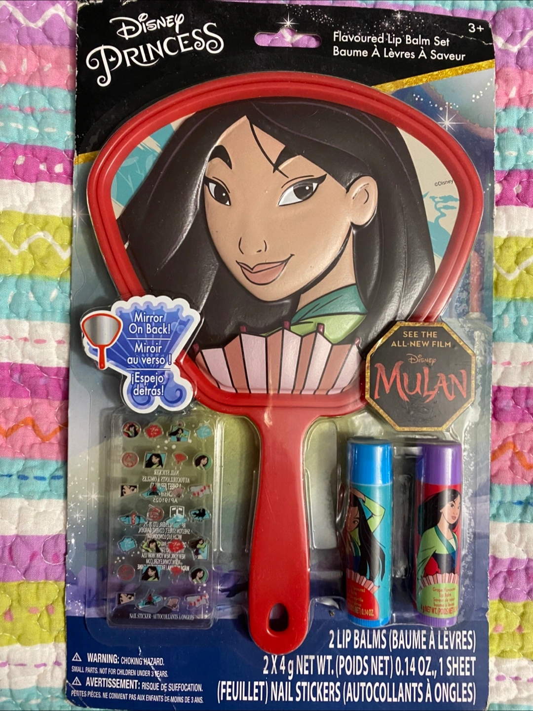 Selling a brand new Disney Princess Mulan flavoured lip balm set! This set includes two lip balms, each 2 x 4 g net wt (poids net) 0.14 oz, and one sheet of nail stickers (autocollants à ongles). Super cute for any Mulan fan!