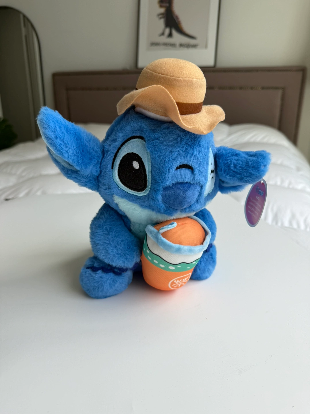 65Super cute Stitch plushie! He's wearing a little hat and holding a drink. Perfect for any Disney fan or collector