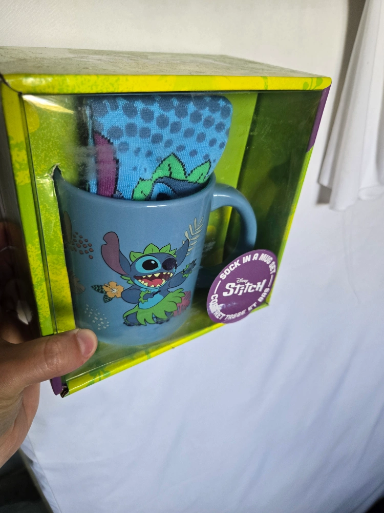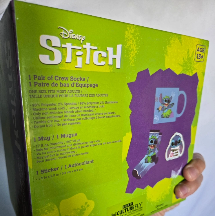 10Selling a Disney Stitch "Sock in a Mug Set"! This set includes one pair of crew socks, one mug with a 17 fl. oz capacity (502.75 ml), and one sticker (1.5 in x 2.5 in / 3.8 cm x 6.4 cm). The socks are one size fits most adults, made of 98% polyester and 2% spandex. The mug is safe for microwave and dishwasher top rack. Perfect for any Stitch fan!