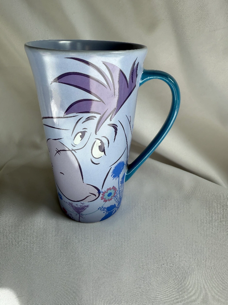 Here's a cute Eeyore mug from the Disney Store! It features Eeyore and floral designs in shades of blue and purple. It's microwave and dishwasher safe too