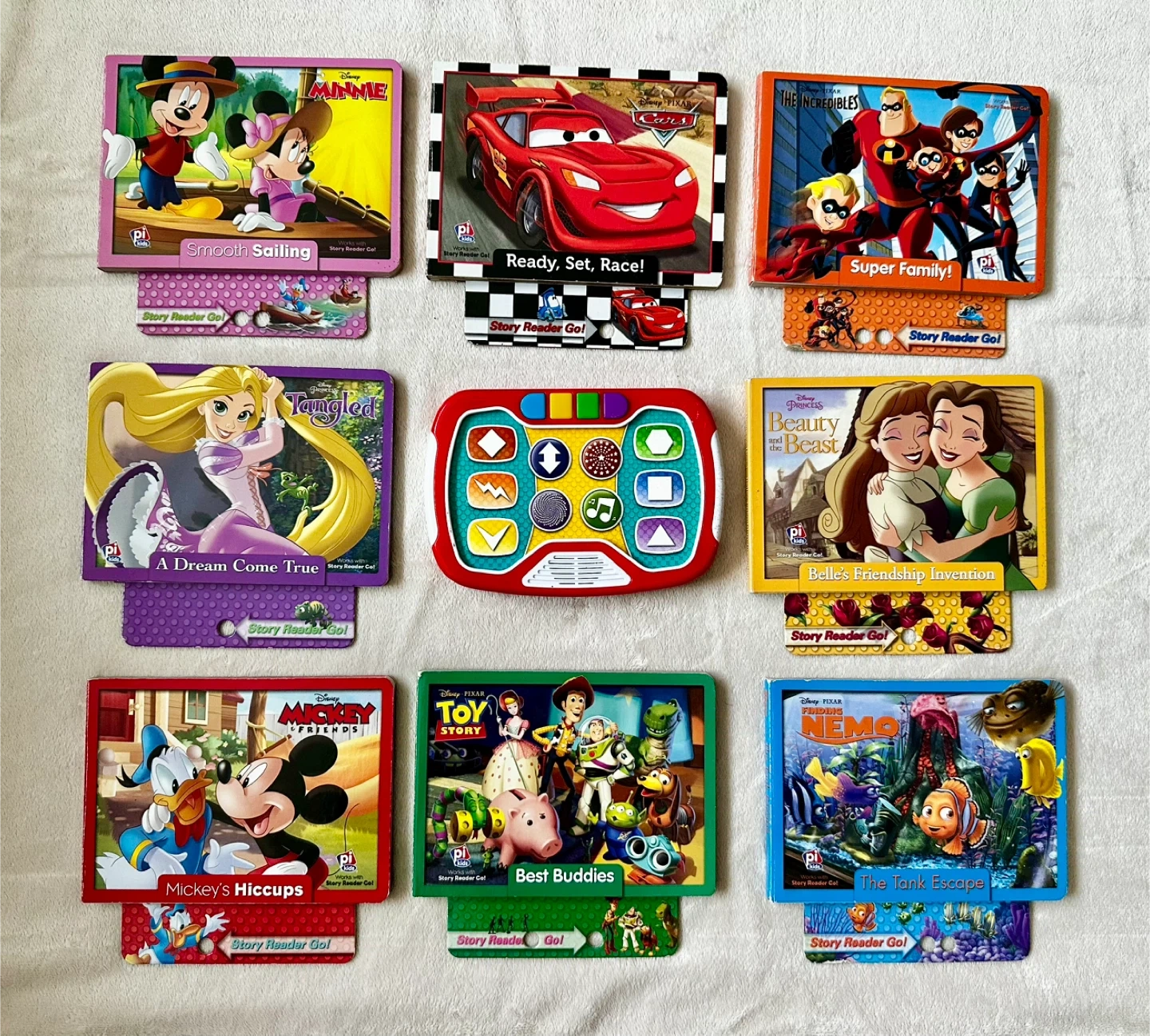 65Selling a set of Disney Story Reader Go! books and the interactive reader. Includes titles like Mickey & Minnie, Cars, The Incredibles, Tangled, Beauty and the Beast, Mickey Mouse & Friends, Toy Story, and Finding Nemo. Great for young readers!