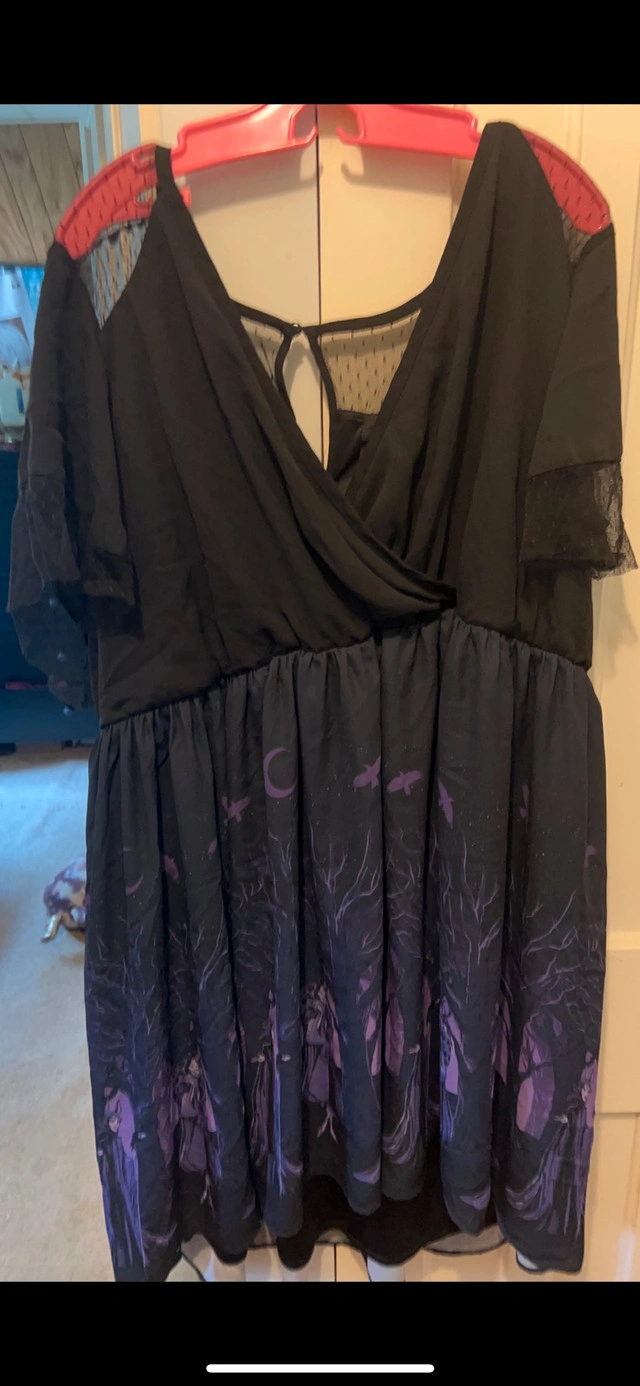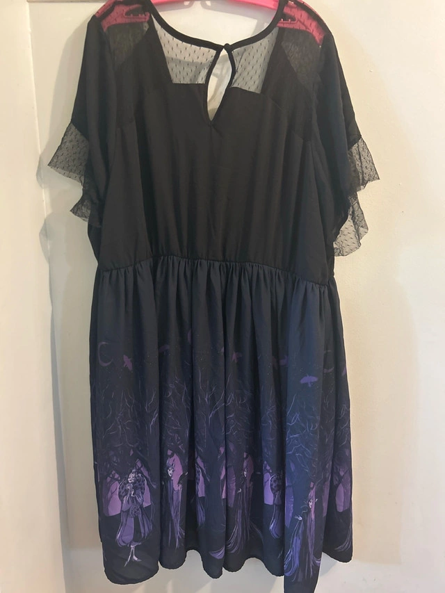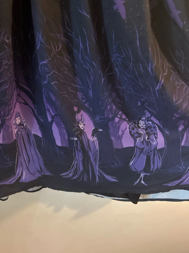 This Torrid Disney Villains dress features a flattering design with a surplice neckline and short sleeves, perfect for making a statement. The dress showcases a unique print of iconic Disney villains, including Maleficent, Evil Queen, and Ursula, set against a dark and enchanting forest backdrop. The dress is in good condition, with the print still vibrant and the fabric well-maintained. I'm asking $40 for this dress, which is a fair price considering its condition and the retail value of similar Torrid dresses. If you're seeing this ad, yes, it's still available!
