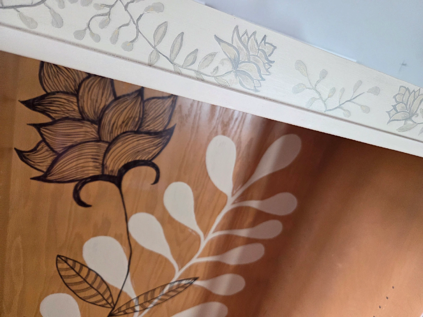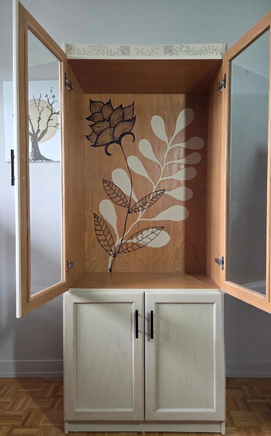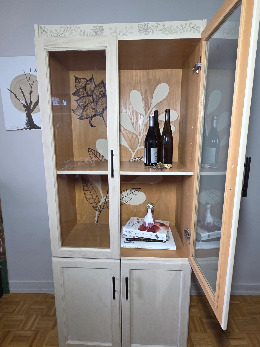 Selling a display cabinet with glass doors. It features a unique floral design on the back panel. The cabinet has a light wood finish and black handles. Perfect for displaying your favourite items! I started sanding the structure and doors. I applied 2 coat of primer and then water paint color. For the doors I did wather down paint to keep the wood grain. For the final protection I applied a clear finish coat. The handles are matte black stainless steel.