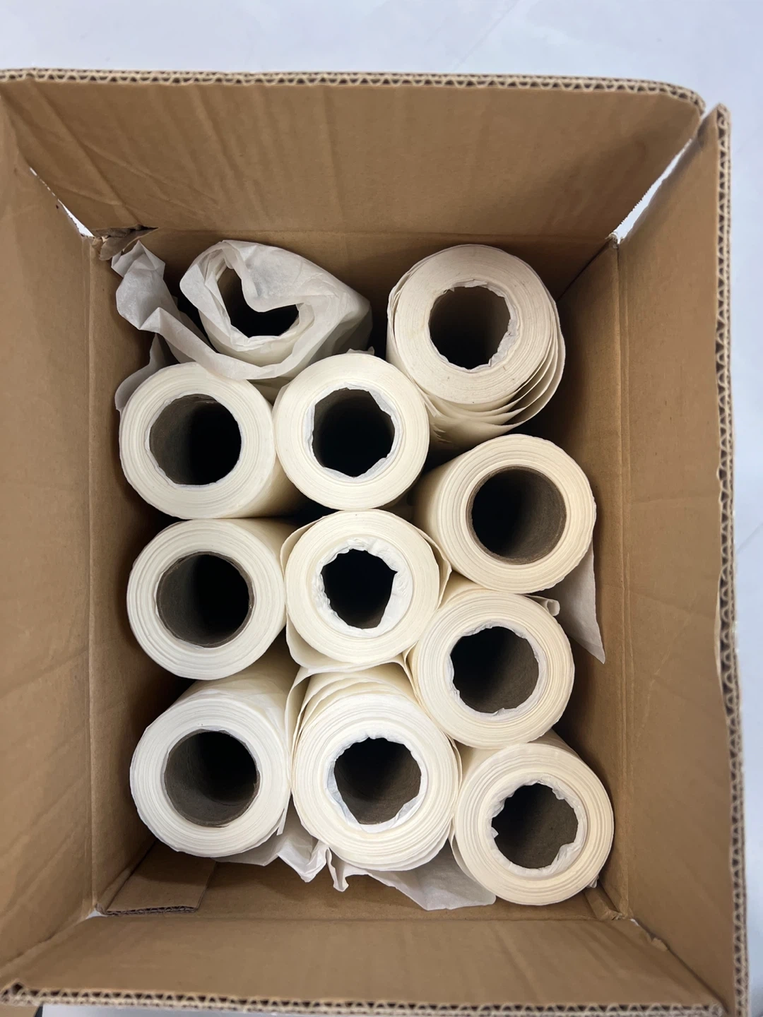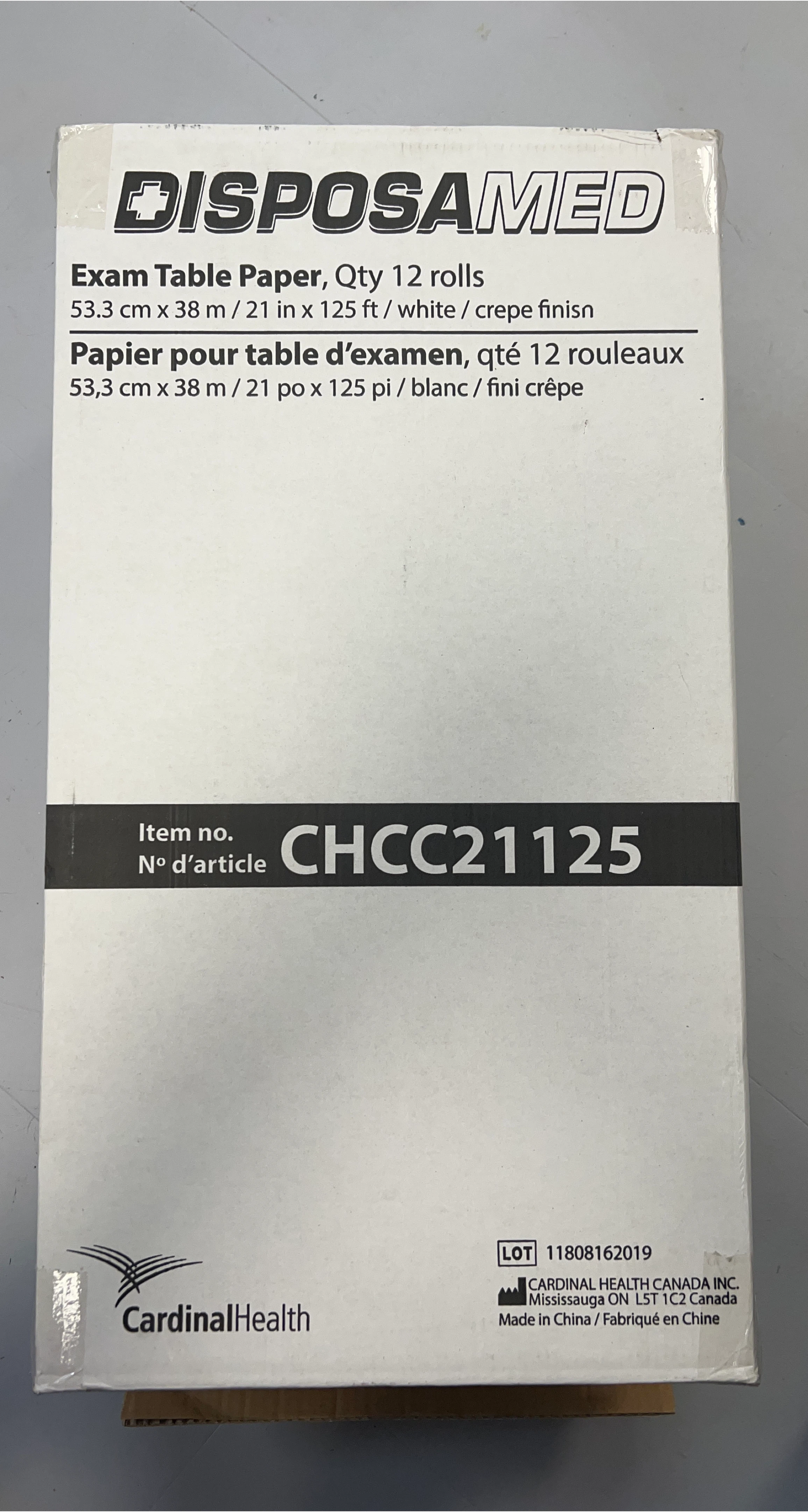 20A box of Disposamed Exam Table Paper. It contains 9 rolls of white crepe finish paper. Each roll measures 53.3 cm x 38 m / 21 in x 125 ft. Perfect for medical or spa use! Open Box.