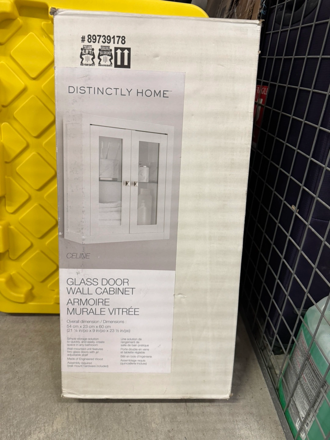 21New in box. White wall cabinet with glass doors. Features adjustable shelf. Assembly required.
