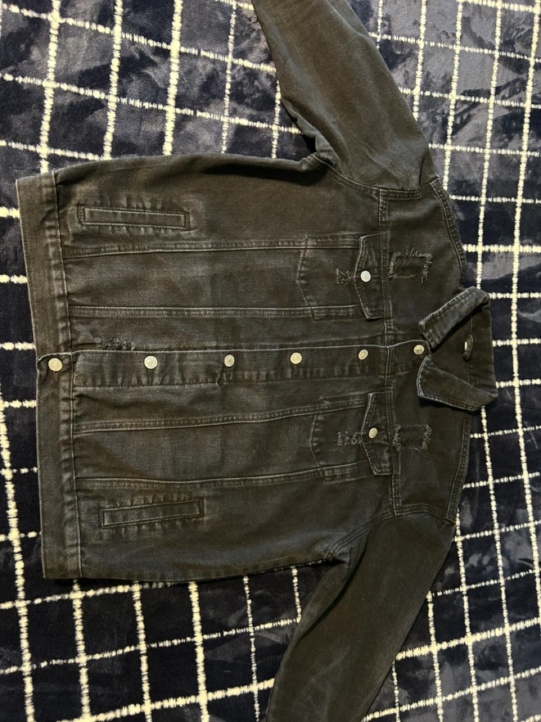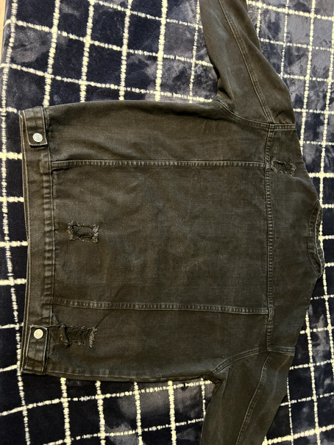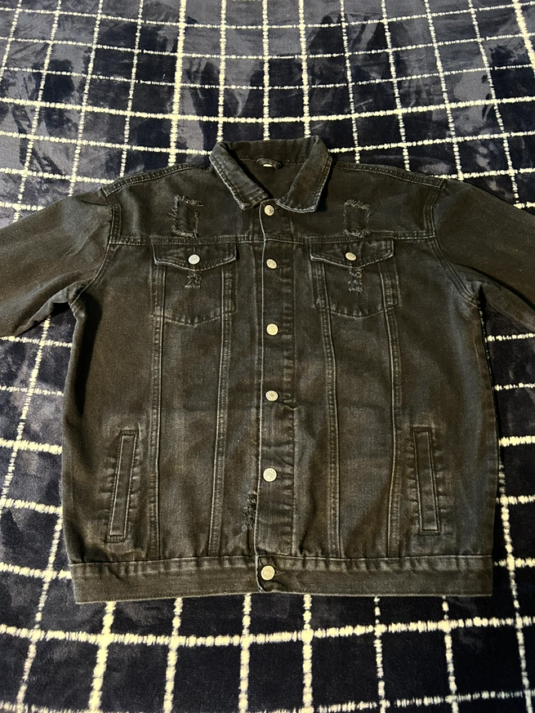 Selling a distressed black denim jacket. It's in great condition and ready for a new home! It features a classic button-down style with a worn-in look
