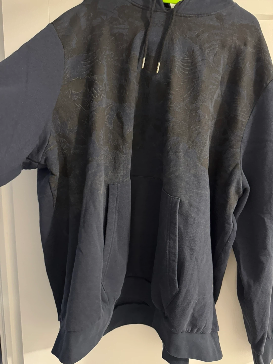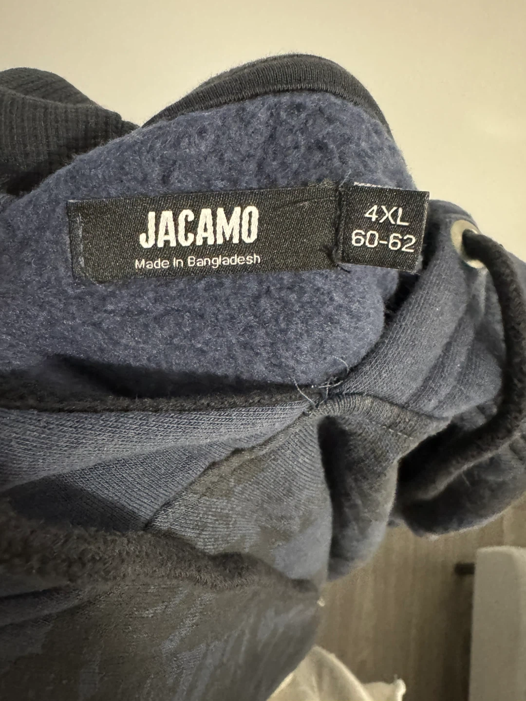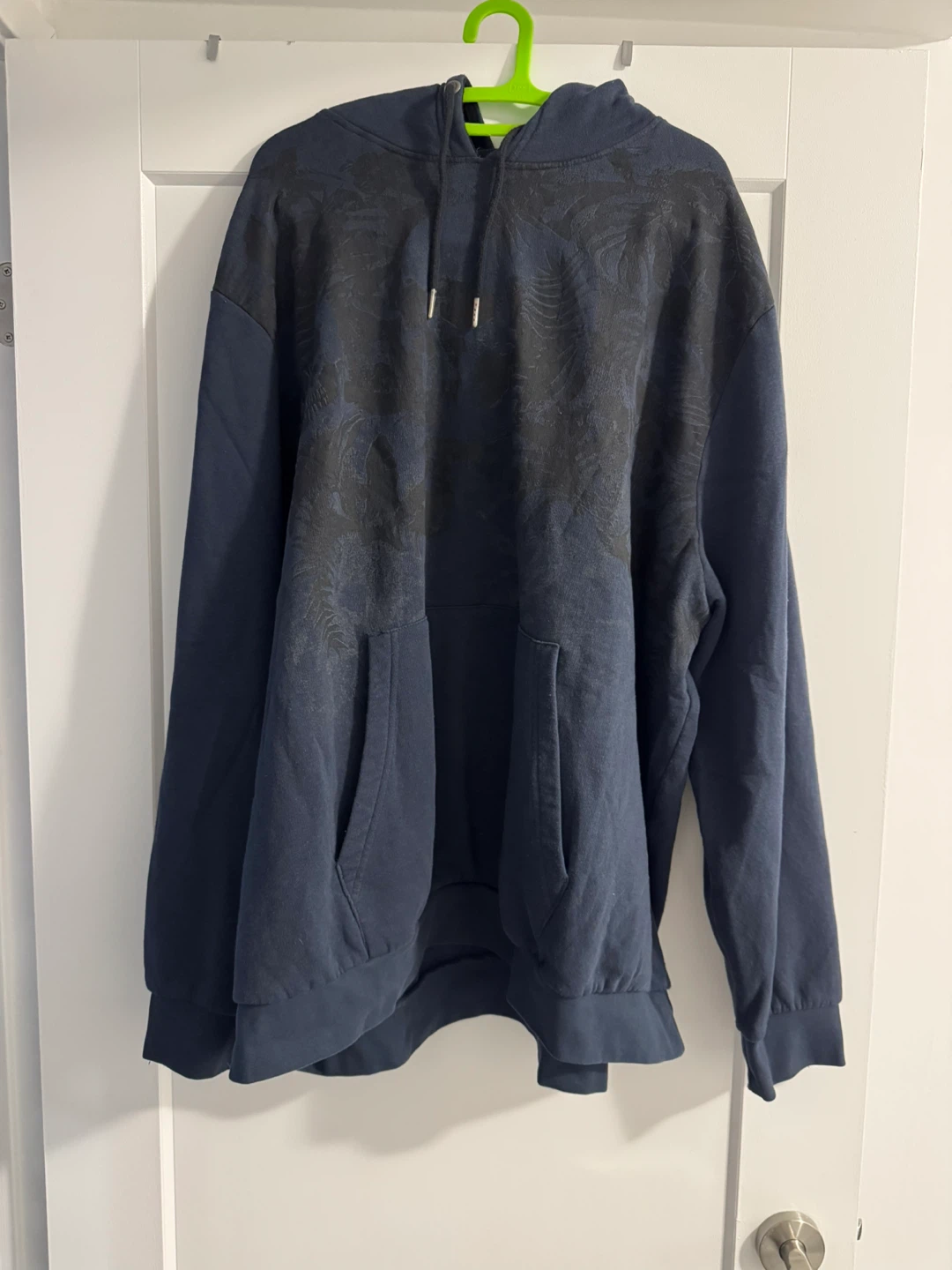 Navy blue hoodie with a patterned design on the chest. Made in Bangladesh. Size 4XL (60-62).