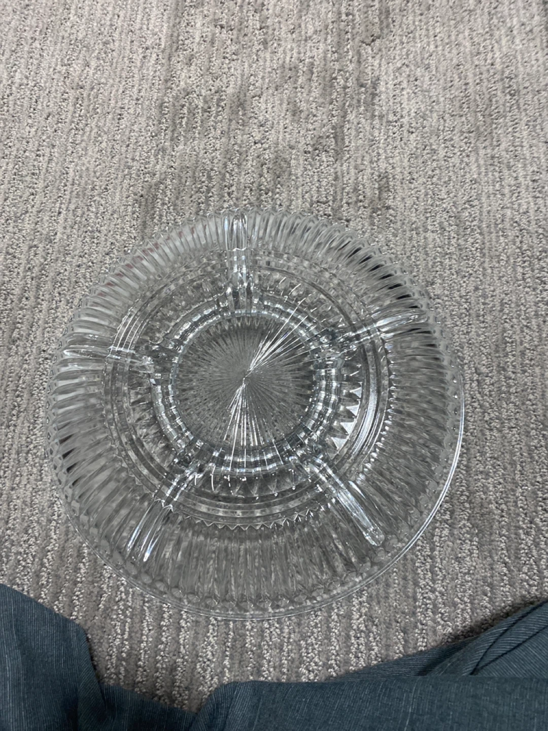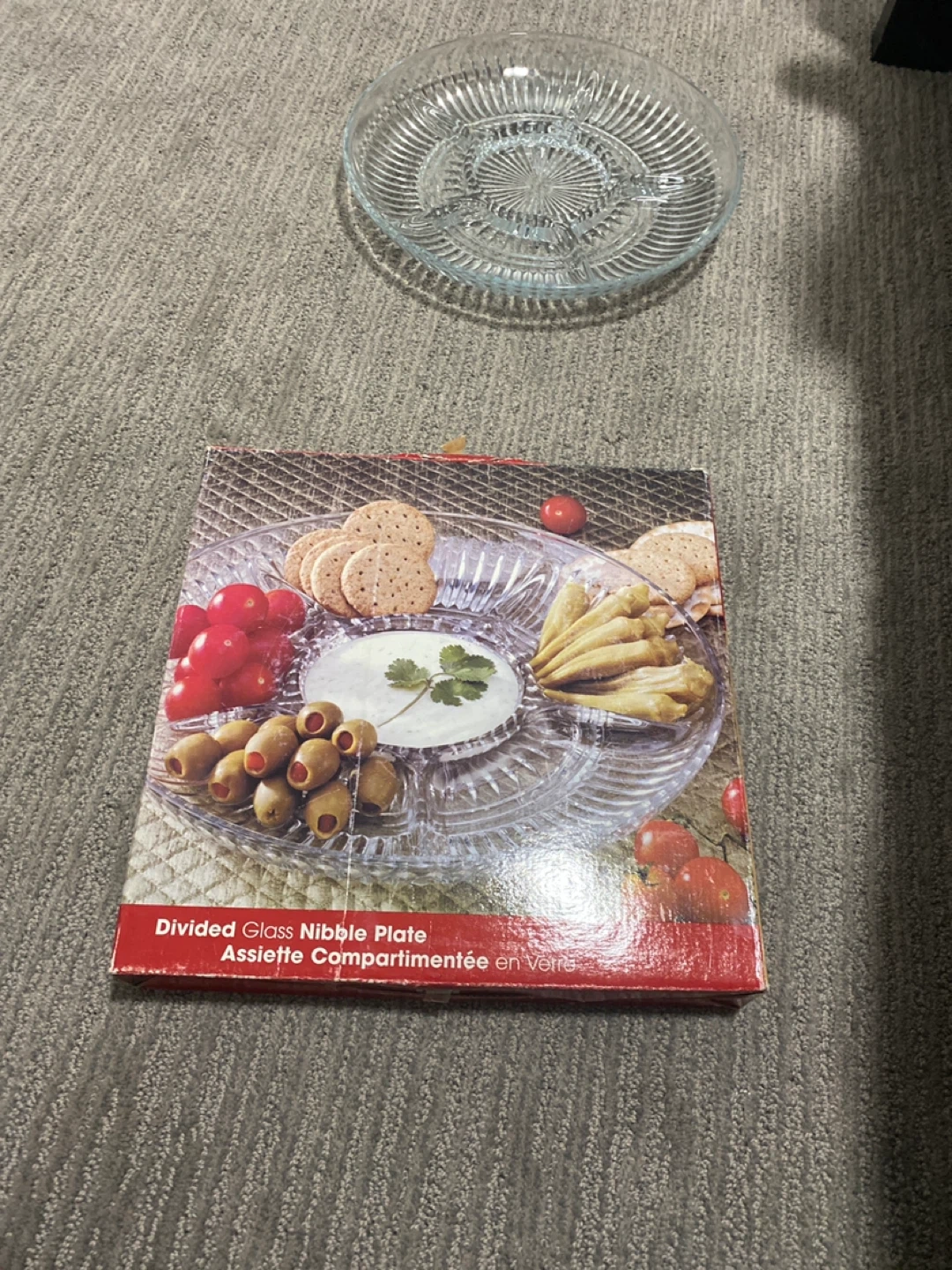 Selling a divided glass nibble plate! It's perfect for serving snacks or appetizers at your next gathering. It's in great condition and ready to use! Made out of glass