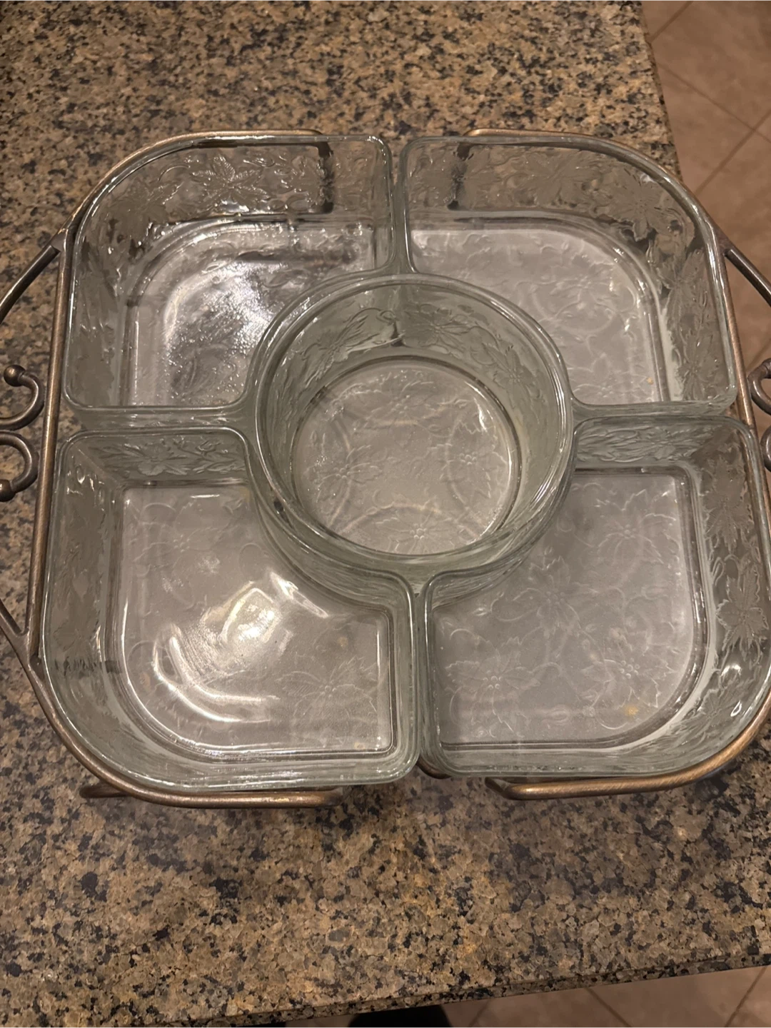 60Selling a divided serving tray with a metal stand. It's perfect for serving snacks or appetizers at your next gathering. The tray is in good condition and ready for a new home