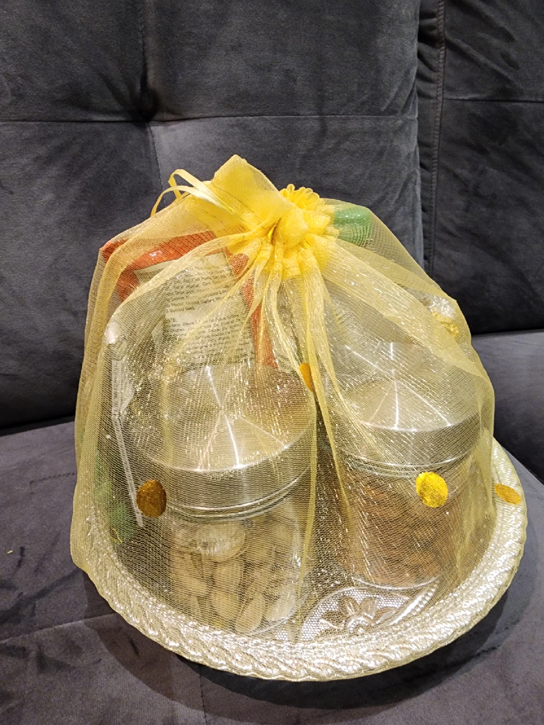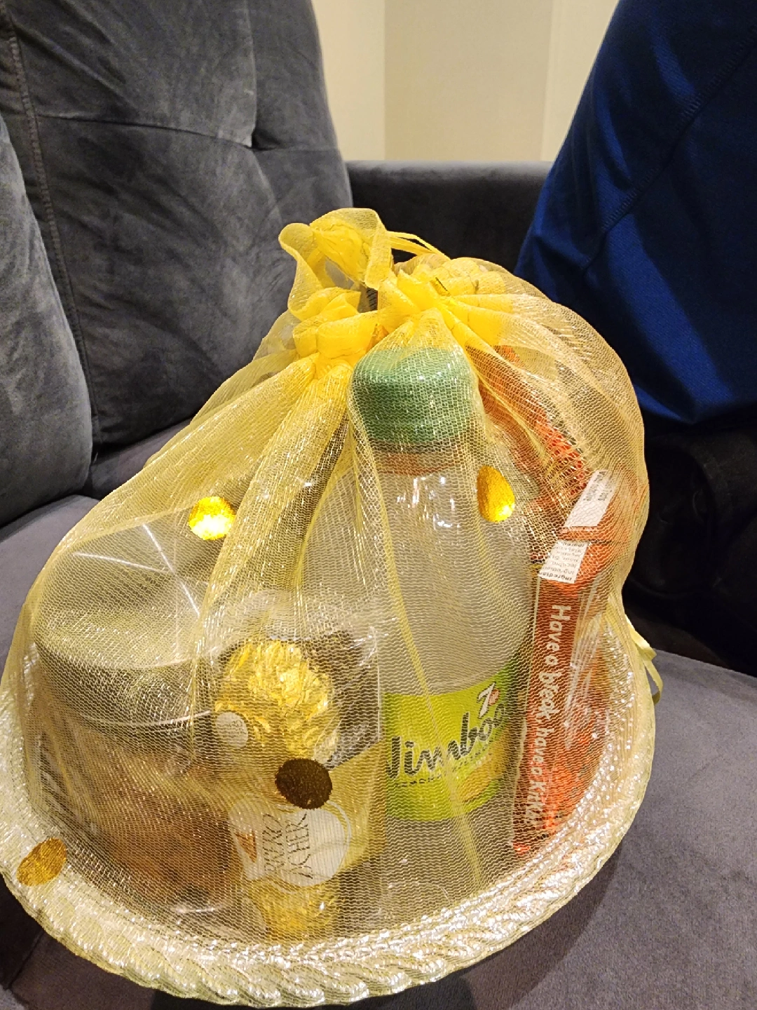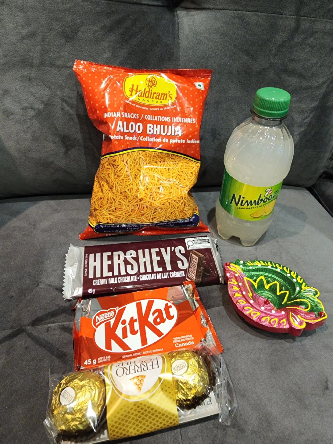 A lovely Diwali gift basket with various snacks and treats! Includes 2 containers nuts, Haldiram's Aloo Bhujia, Hershey's chocolate, Kit Kat, Ferrero Rocher, and a bottle of Nimbooz. Perfect for celebrating the festival of lights!