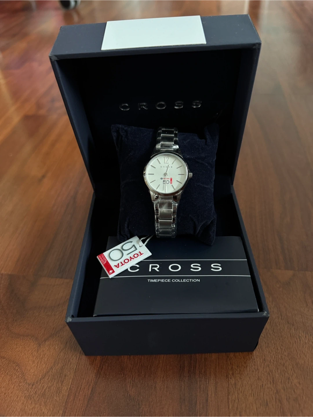 This is a Cross timepiece from their collection. It's a silver-tone watch with a white face. It comes in its original box and has a special tag that reads 'Toyota 50th Anniversary'.