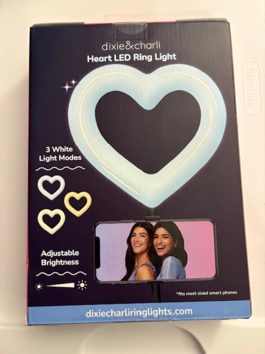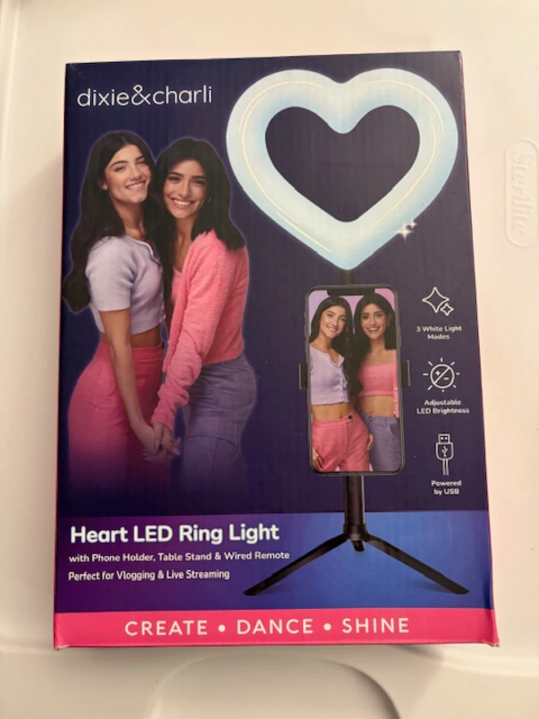 186Selling a brand new Dixie & Charli Heart LED Ring Light! Perfect for vlogging and live streaming. It comes with a phone holder, table stand, and wired remote. Features include: - 3 White Light Modes - Adjustable LED Brightness - Powered by USB Create, Dance, Shine! 🤩