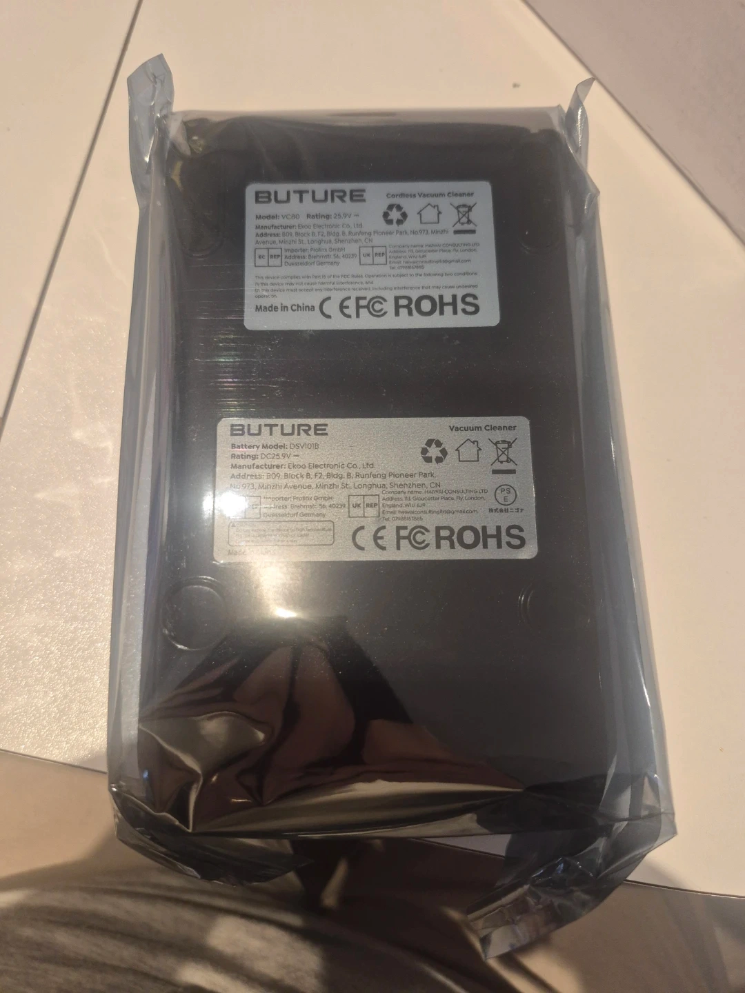 This is a BUTURE replacement battery for the VC10 cordless vacuum cleaner. It's a 25.9V battery. The manufacturer is Choo Electronic Co. Ltd.