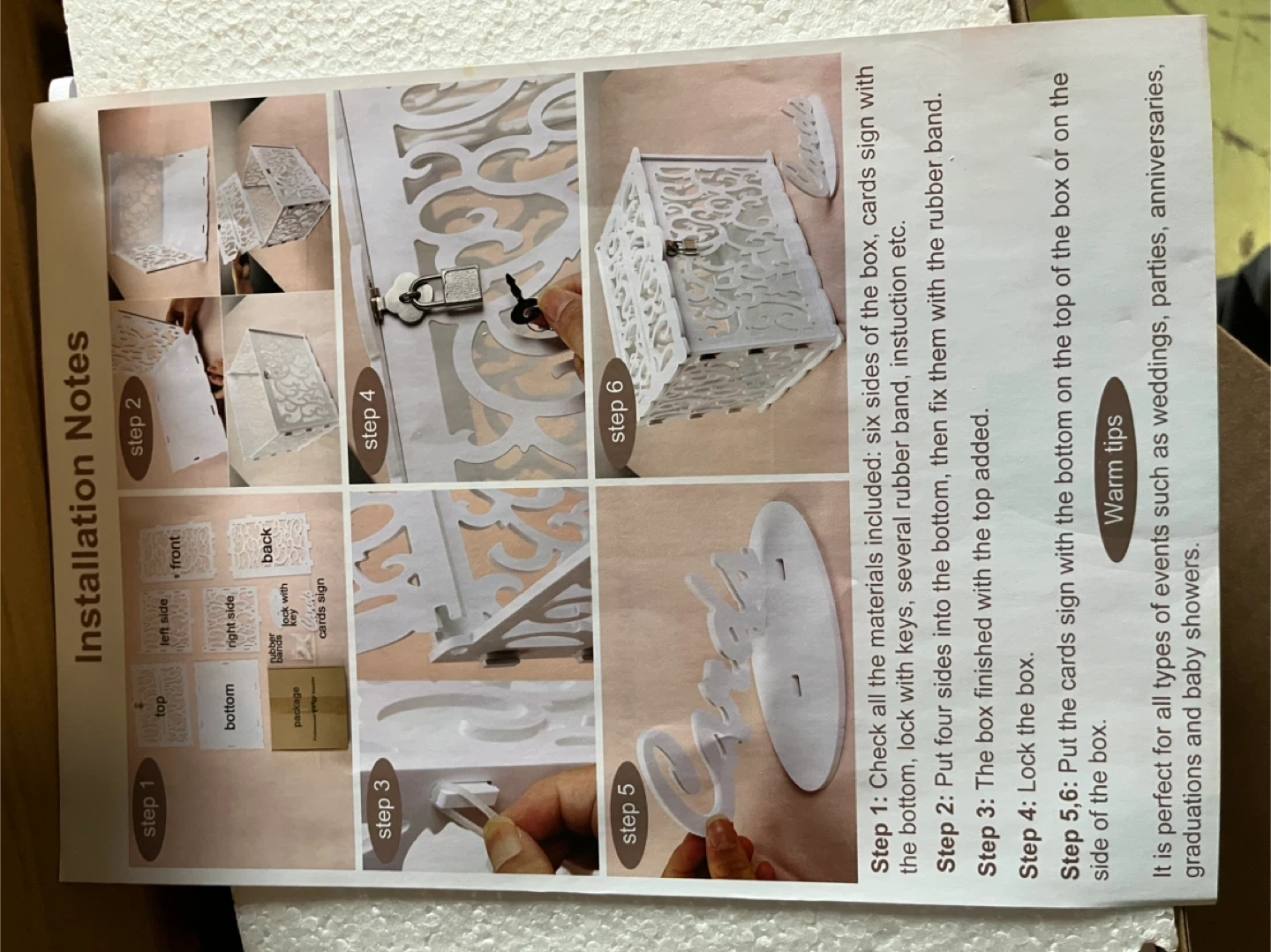 12DIY wedding card box, perfect for weddings, parties, anniversaries, graduations and baby showers! Check all the materials included: six sides of the box, cards sign with the bottom, lock with keys, several rubber band, instruction etc. Put four sides into the bottom, then fix them with the rubber band. The box finished with the top added. Lock the box. Put the cards sign with the bottom on the top of the box or on the side of the box