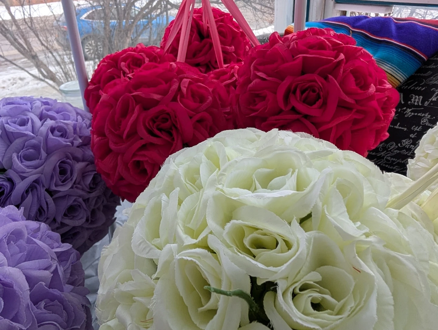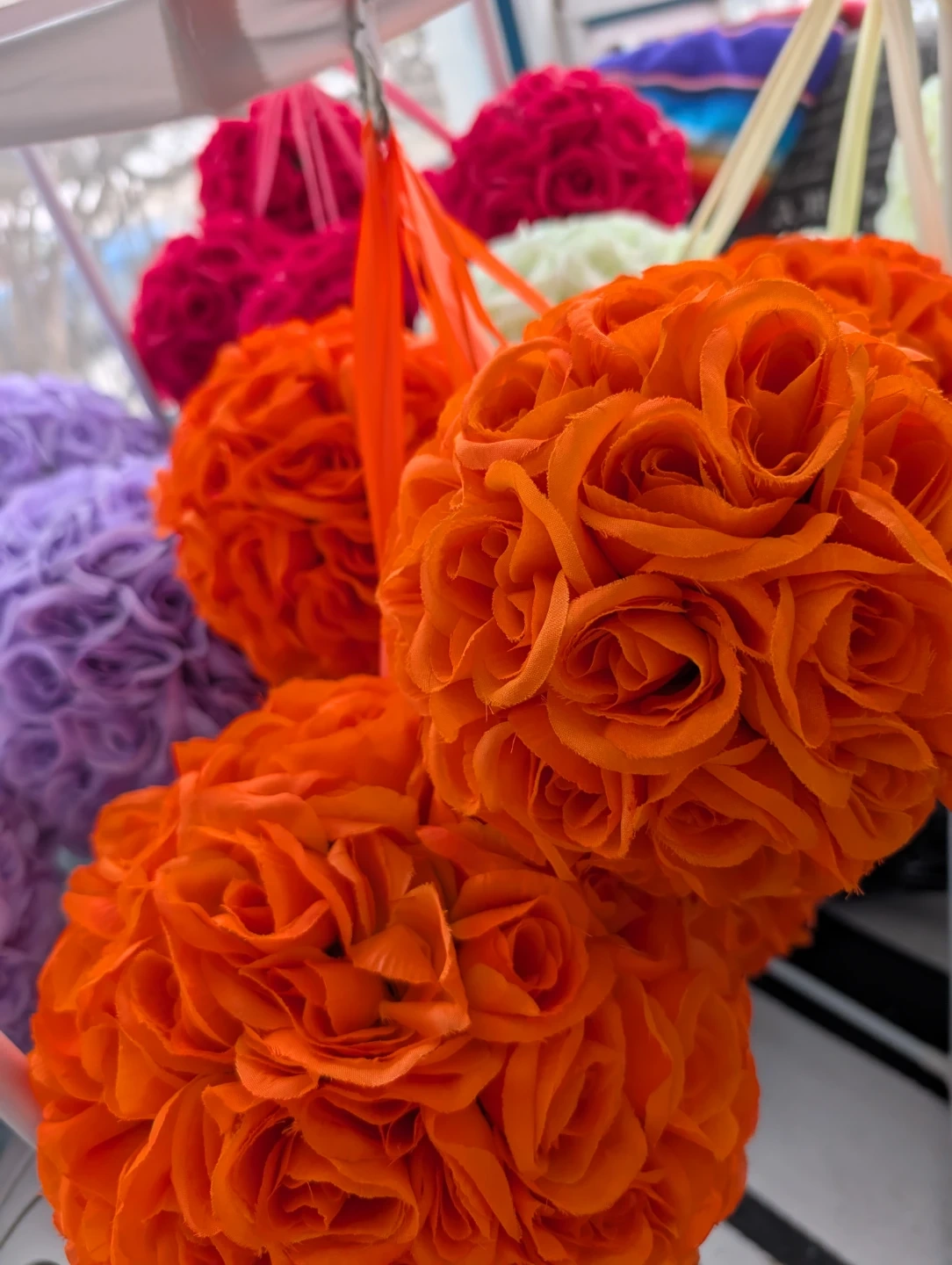 These decorative floral kissing balls are made to look like roses. They come in various colours and have ribbon loops for hanging. They're perfect for adding a romantic touch to events or decor.