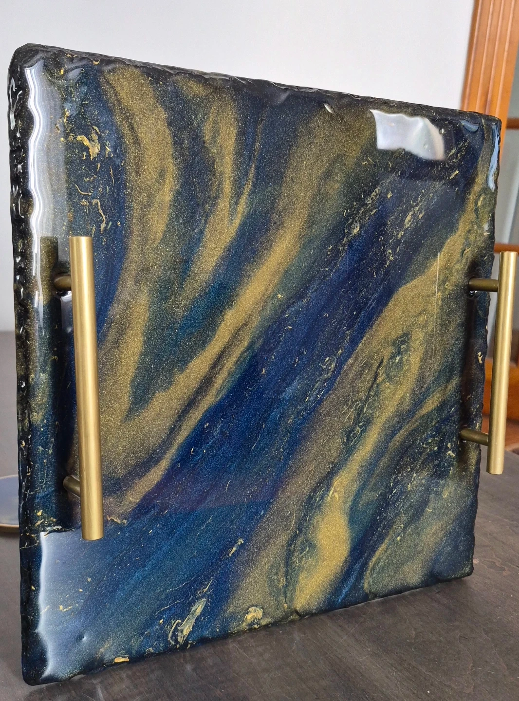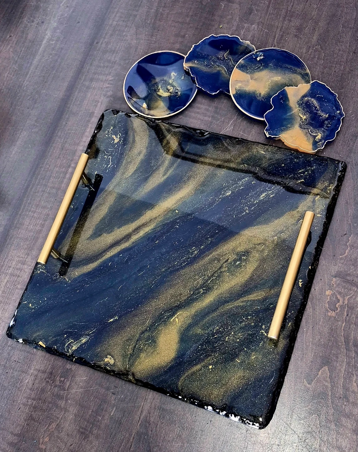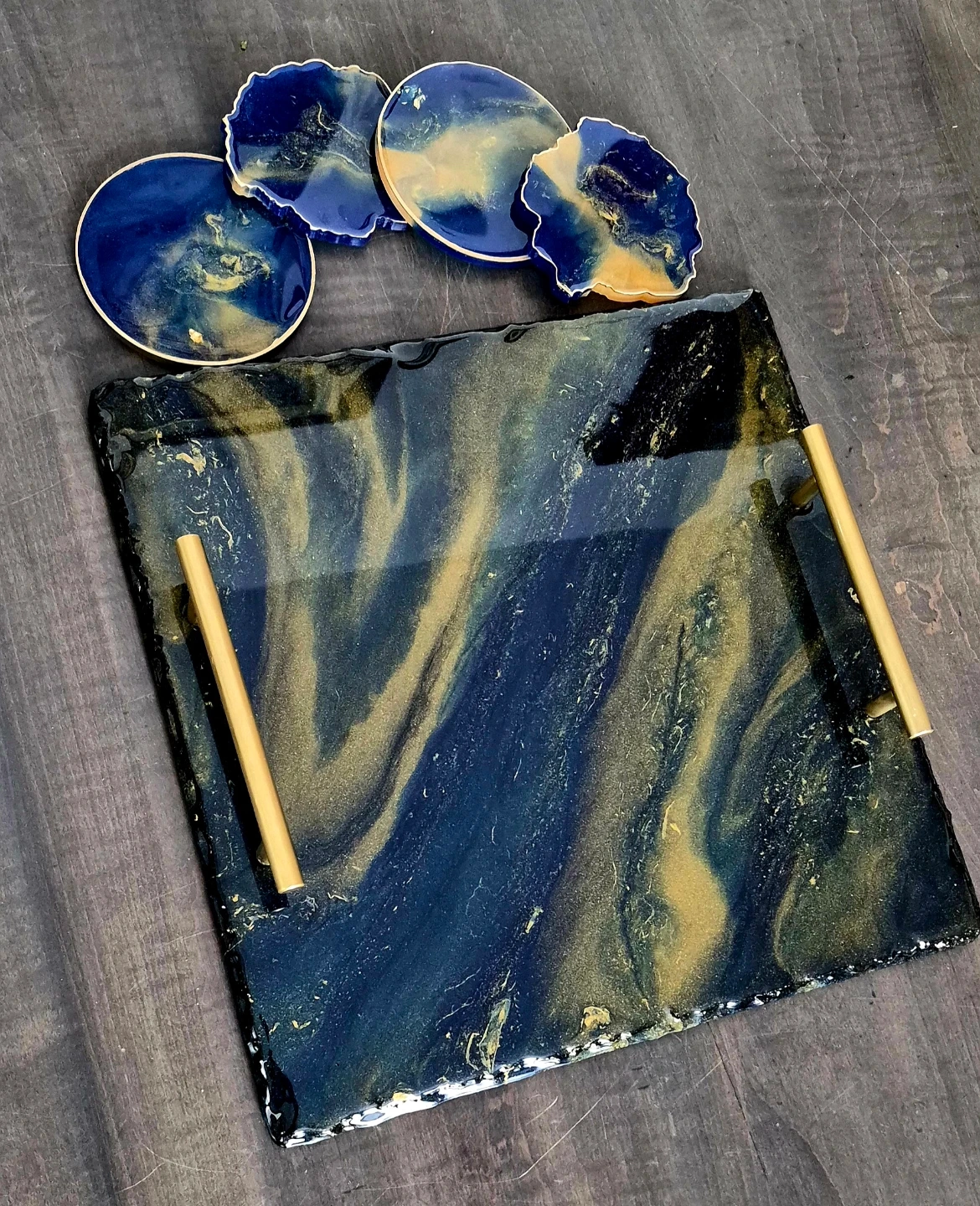 Decorative serving tray and four coasters with a striking blue and gold marbled design. The tray features sturdy gold-toned handles. This set is made from resin and adds a pop of colour to any tabletop.