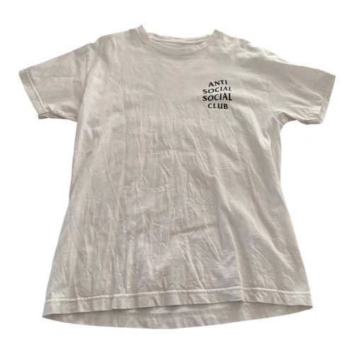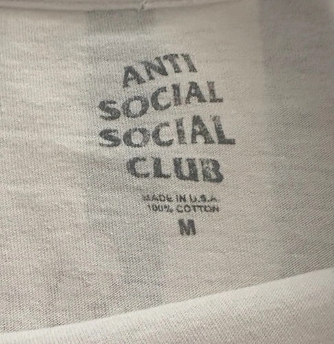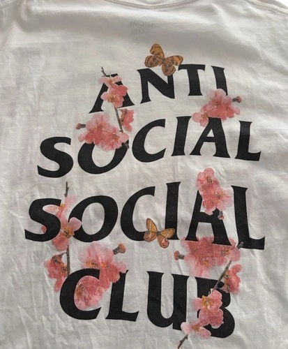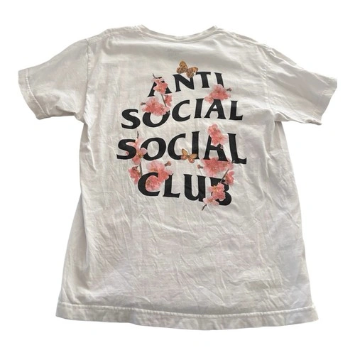 Anti Social Social Club (ASSC) Kkoch T-shirt in white. Features the brand's signature logo with cherry blossoms and butterflies. Color: White with pink floral/butterfly graphics. Material: 100% Cotton. Crew neck, short sleeves, graphic screen print. Size: Medium. Preowned. Some fading on print. Small hole on left sleeve, see image.
