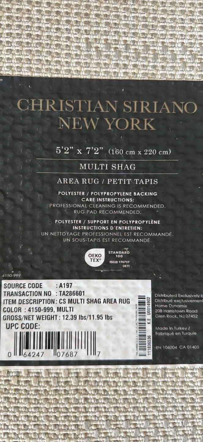 This Christian Siriano New York multi shag area rug measures 5'2" x 7'2". It's made with a polyester and polypropylene backing. Professional cleaning is recommended.