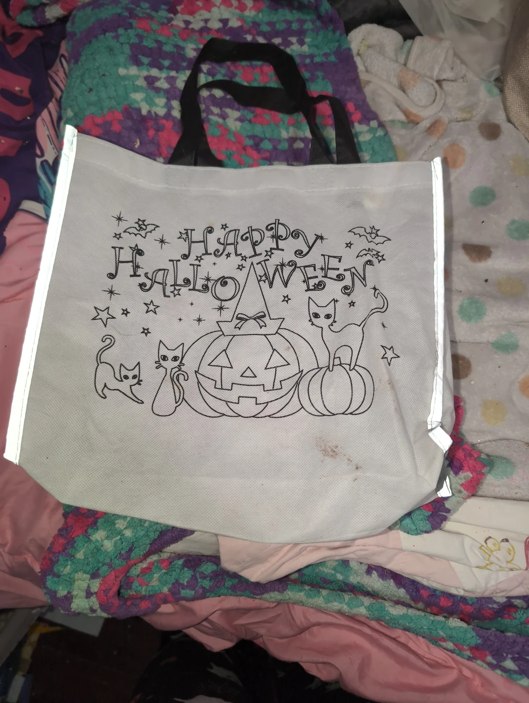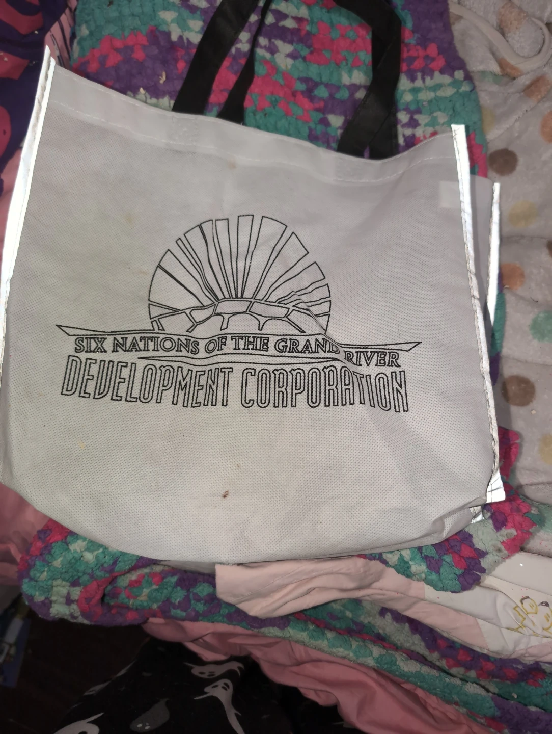 Reusable tote bag with a "Happy Halloween" design on one side and the "Six Nations of the Grand River Development Corporation" logo on the other. It has black fabric handles and reflective silver trim. This bag is useful for carrying groceries or as a festive Halloween accessory.