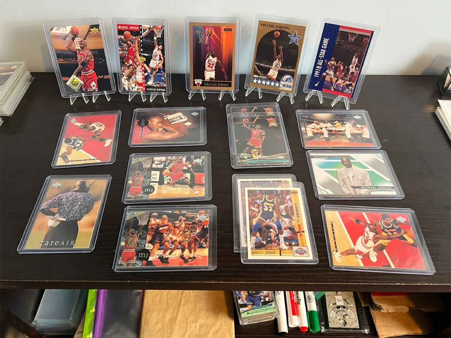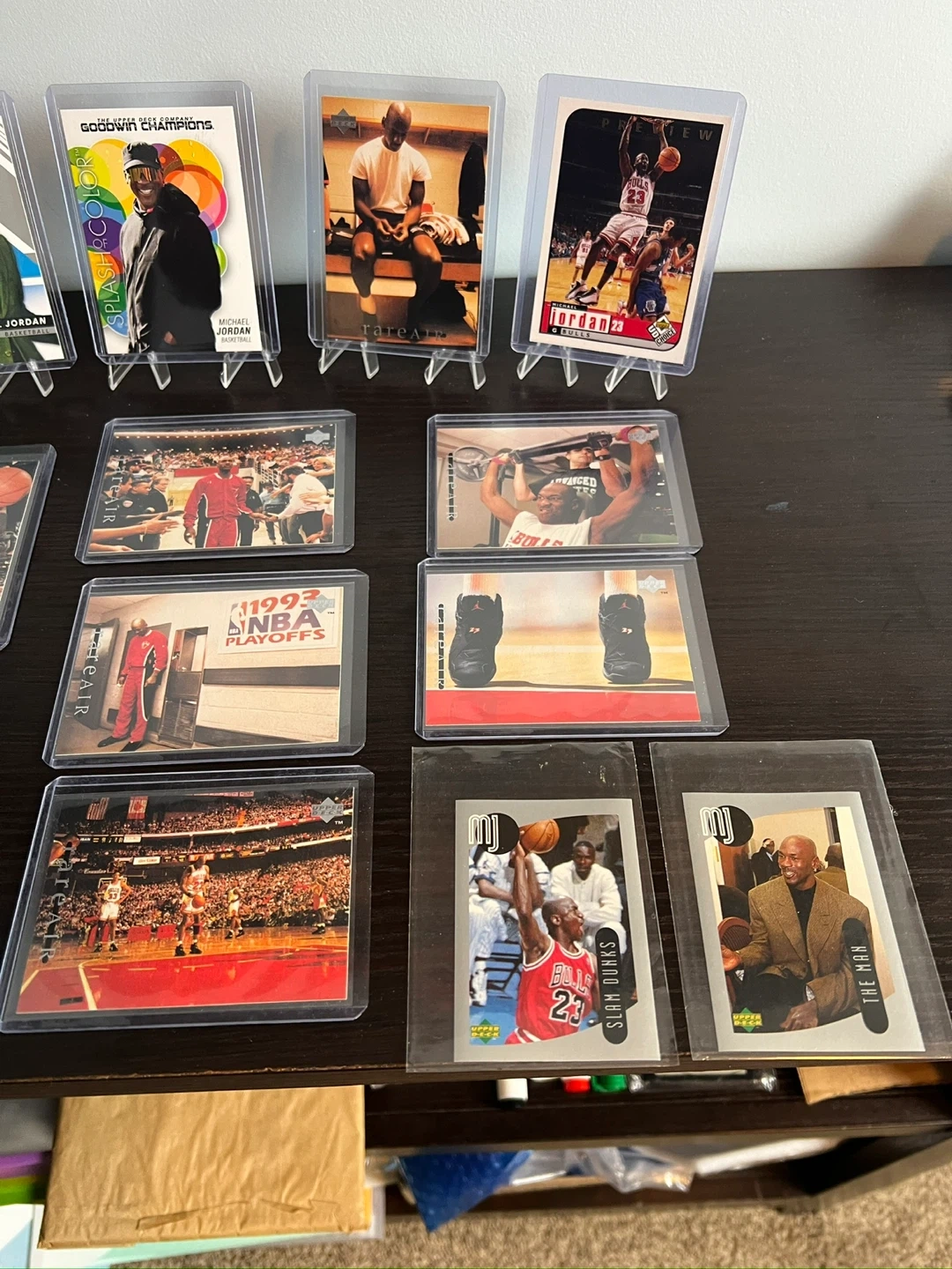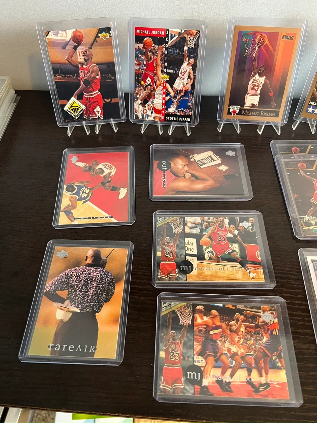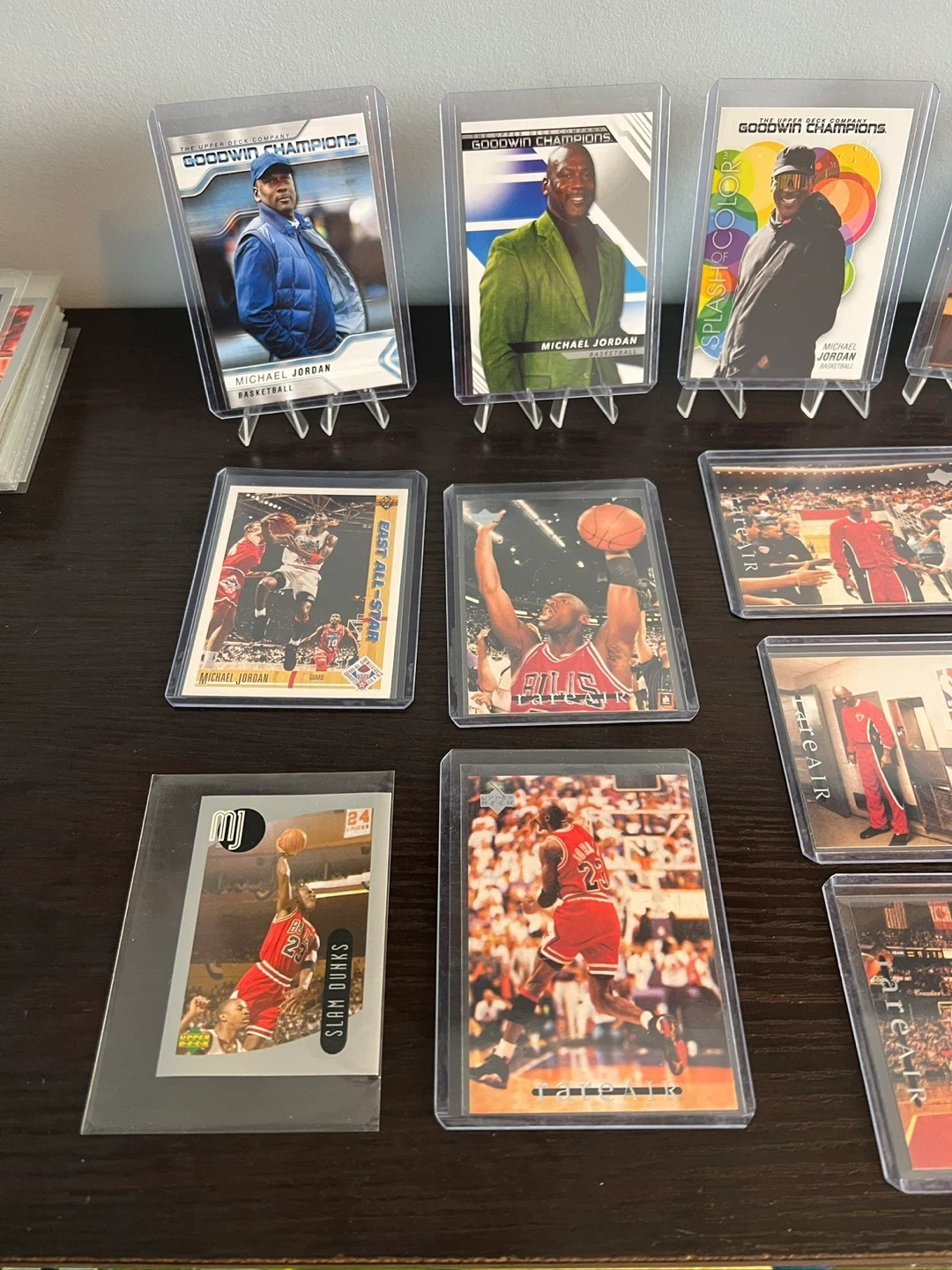 Selling a collection of Michael Jordan basketball trading cards/stickers. They are in protective cases and feature various images of Michael Jordan throughout his career.