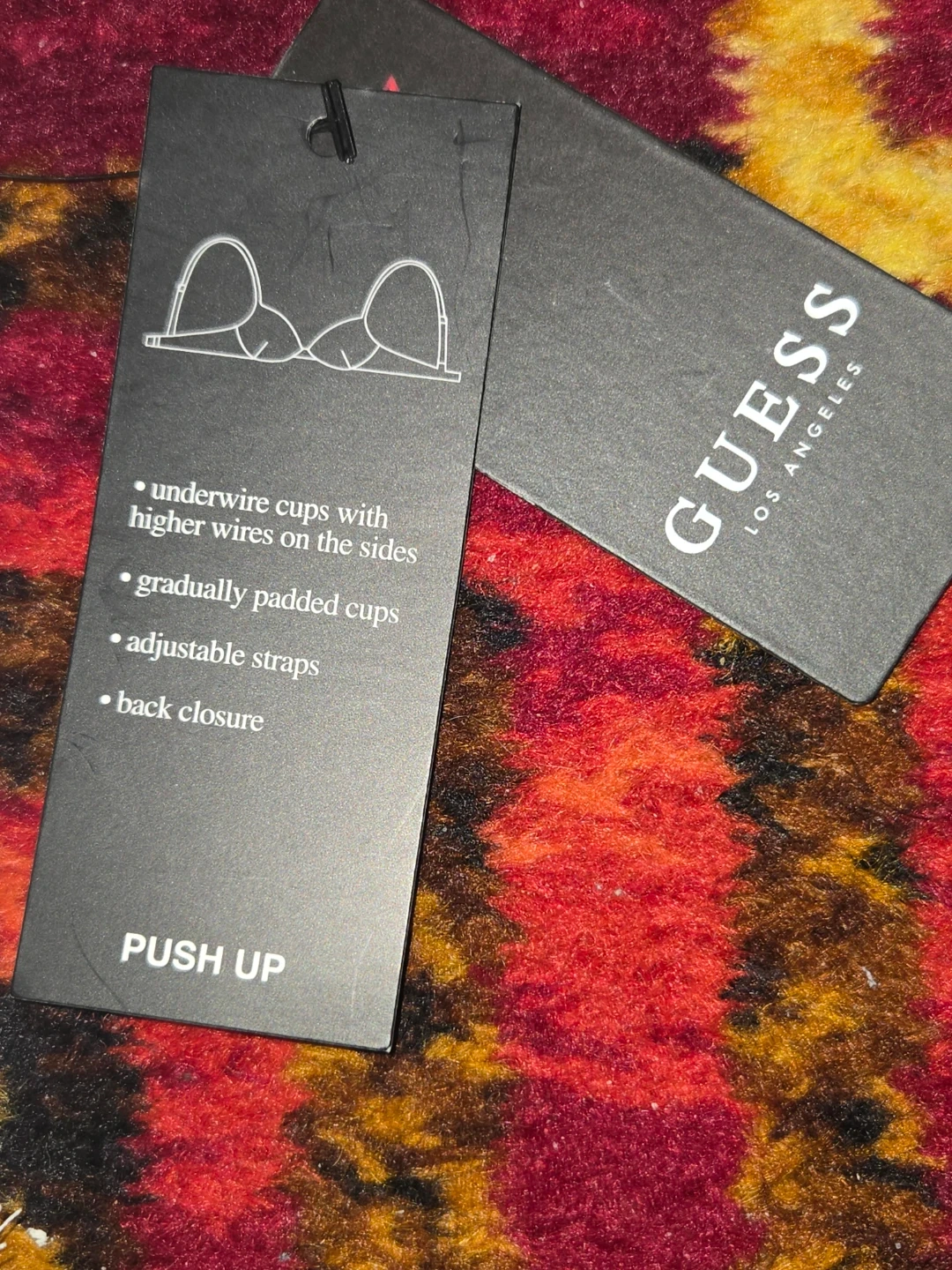 White lace push-up bra by Guess. It features underwire cups with higher wires on the sides and gradually padded cups. The straps are adjustable and it has a back closure. This bra offers a flattering lift and comfortable support.