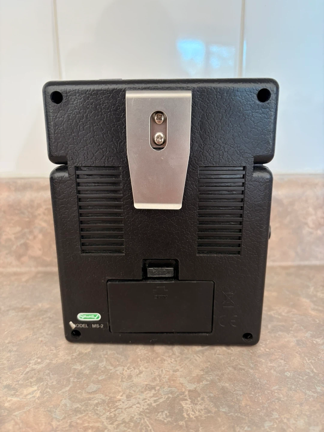 This is a Marshall MS-2 Micro Stack guitar amplifier. It's a compact unit with volume and tone controls. It has a clip on the back for easy portability.