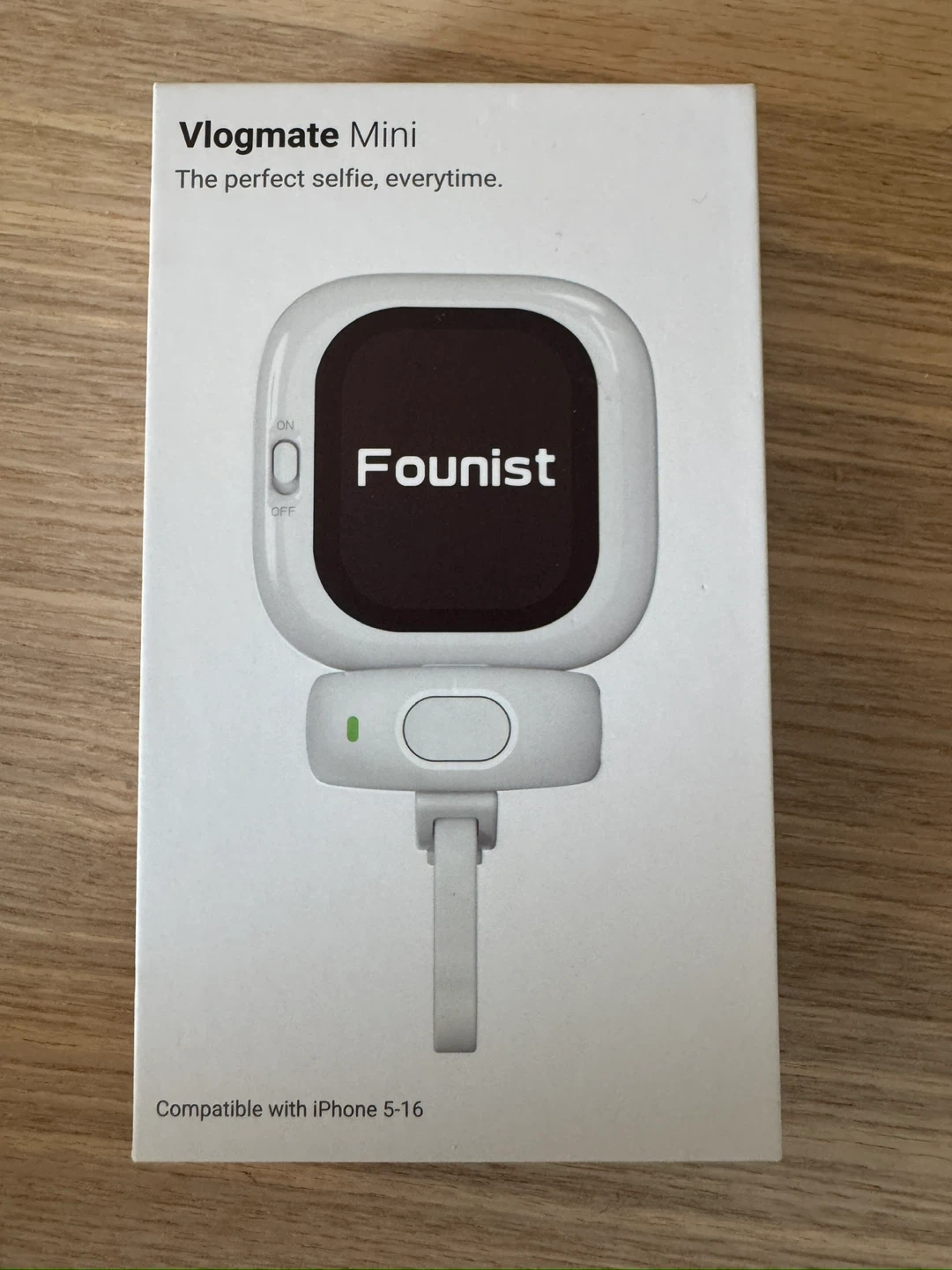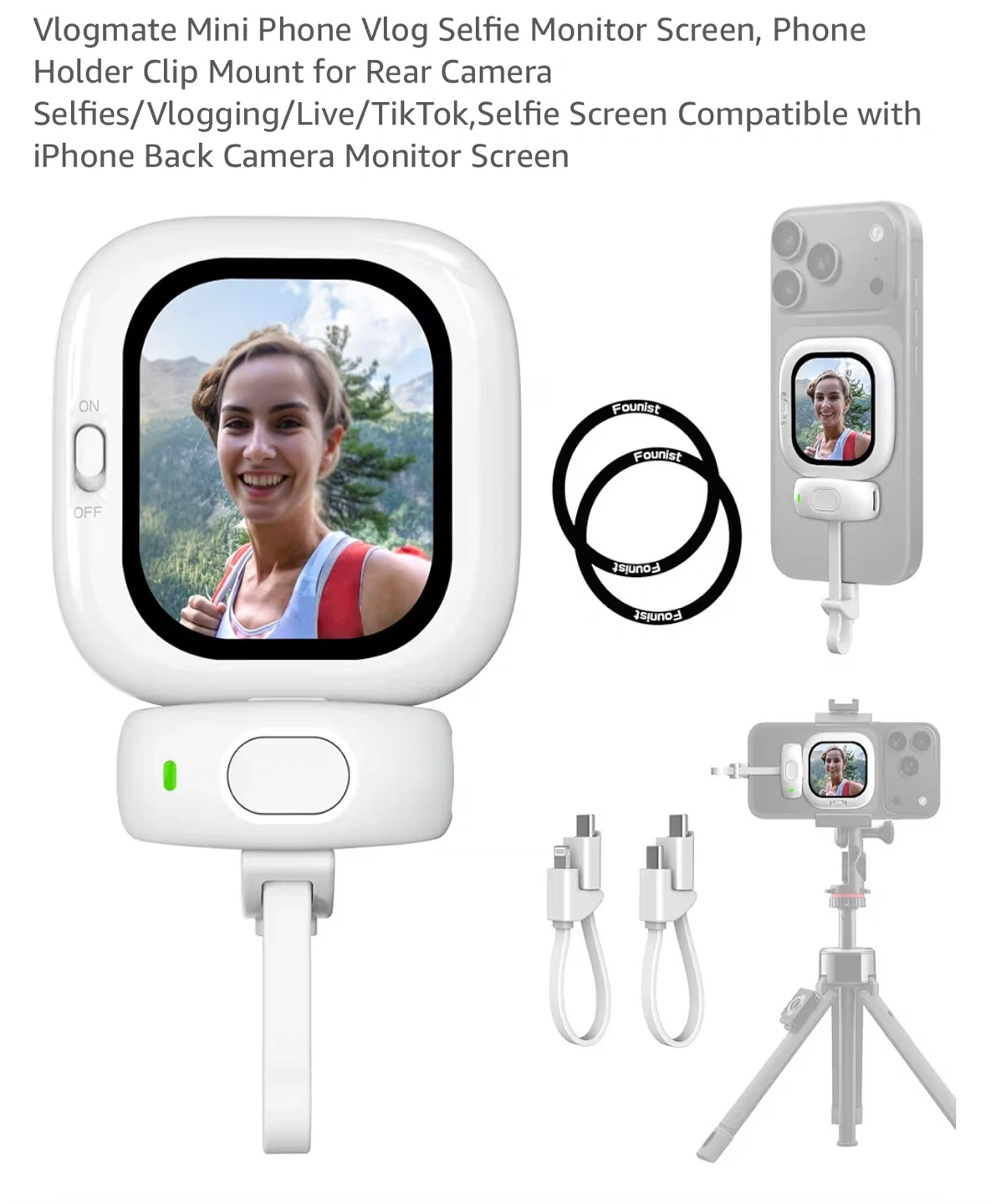 This is the Founist Vlogmate Mini phone vlog selfie monitor screen. It's compatible with iPhone 5-16. This device helps you capture the perfect selfie every time, enhancing your vlogging experience. It includes a phone holder clip mount for rear camera use.