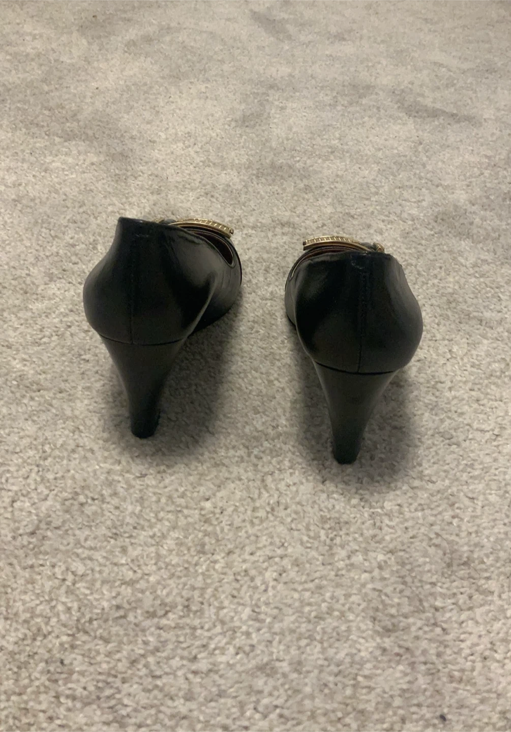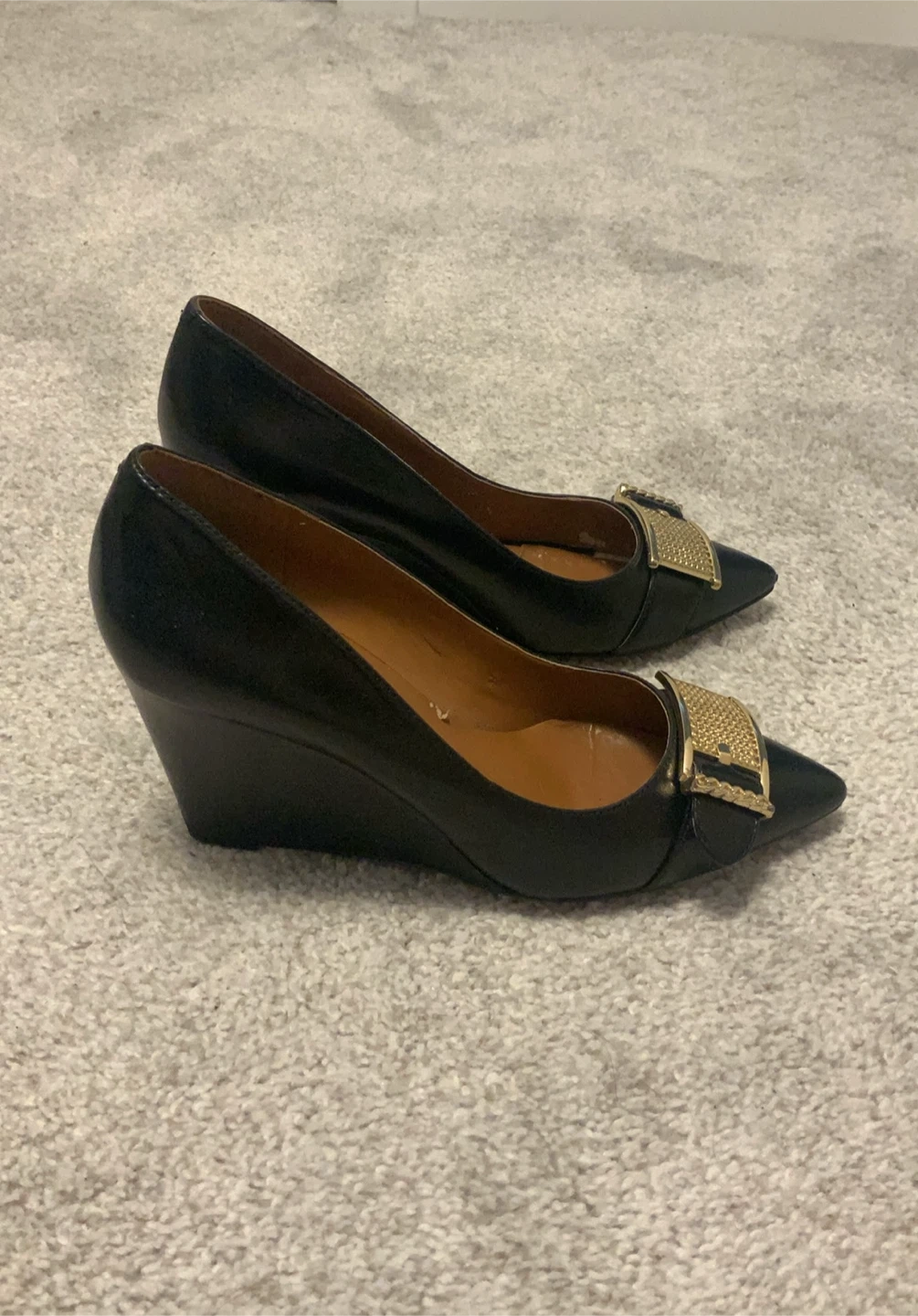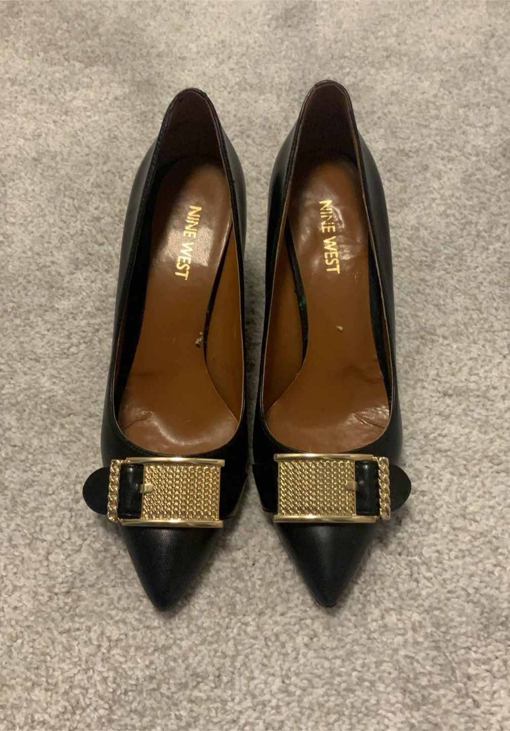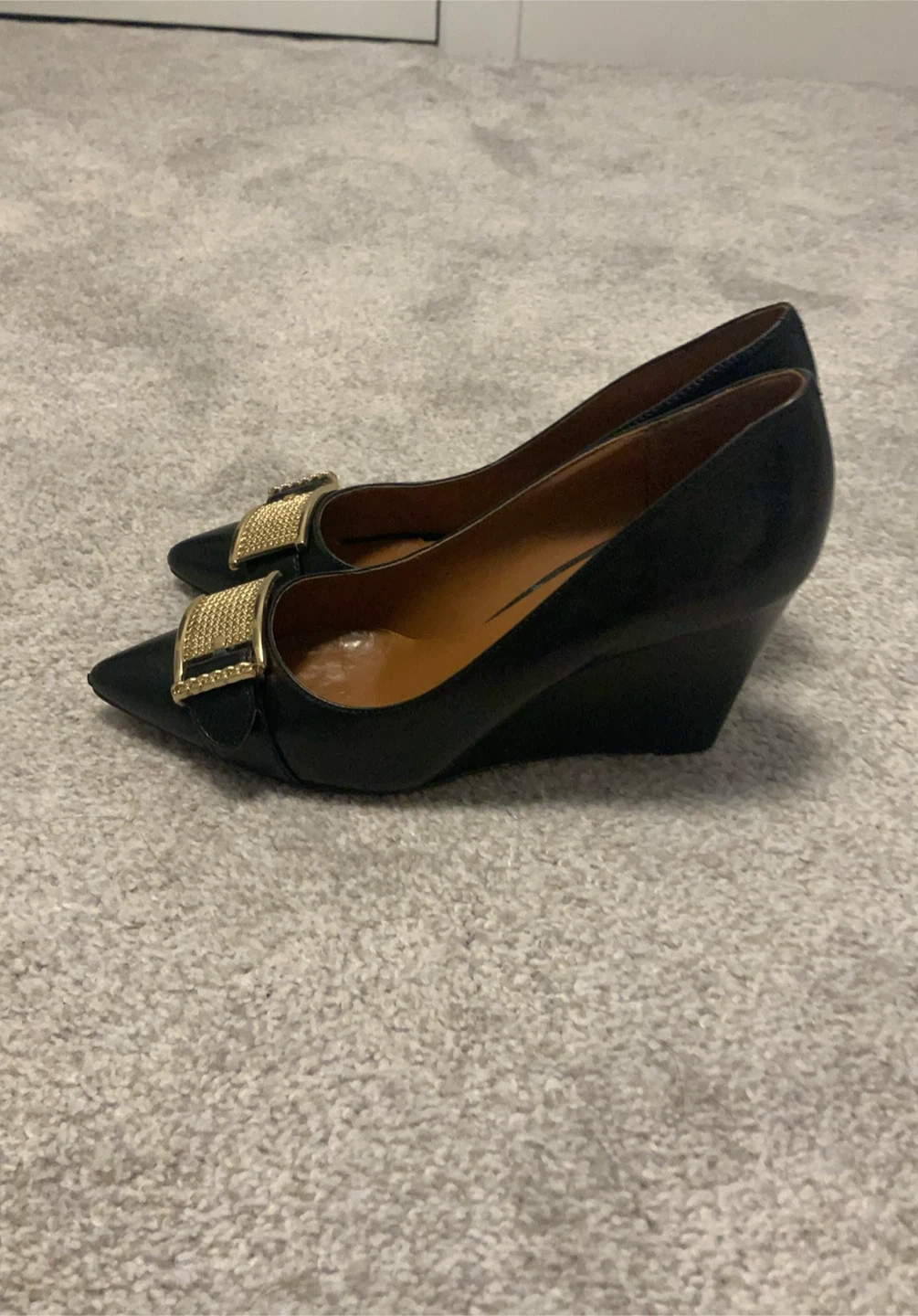 These Nine West wedge heels are black with a stylish gold buckle detail. They have a pointed toe and a comfortable wedge heel. Classic footwear for many occasions!