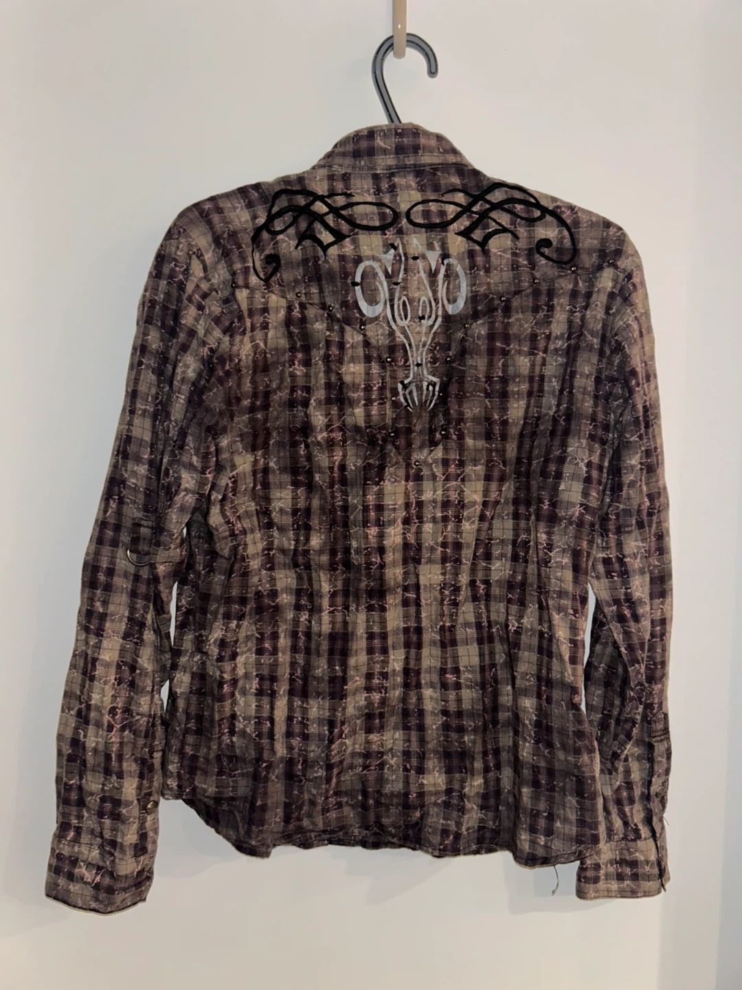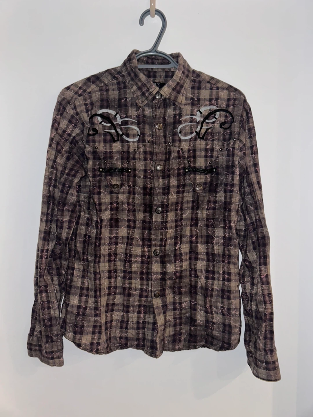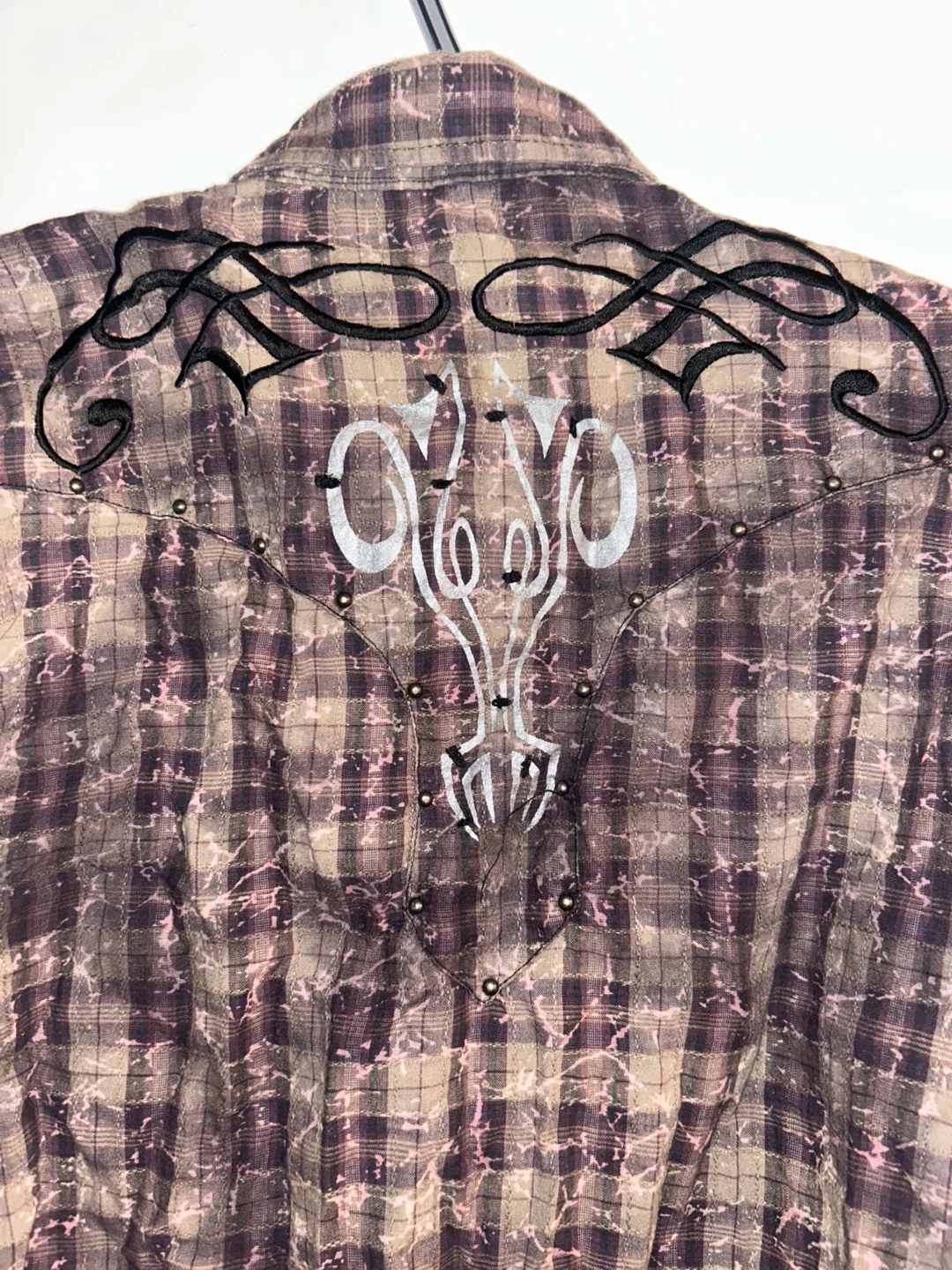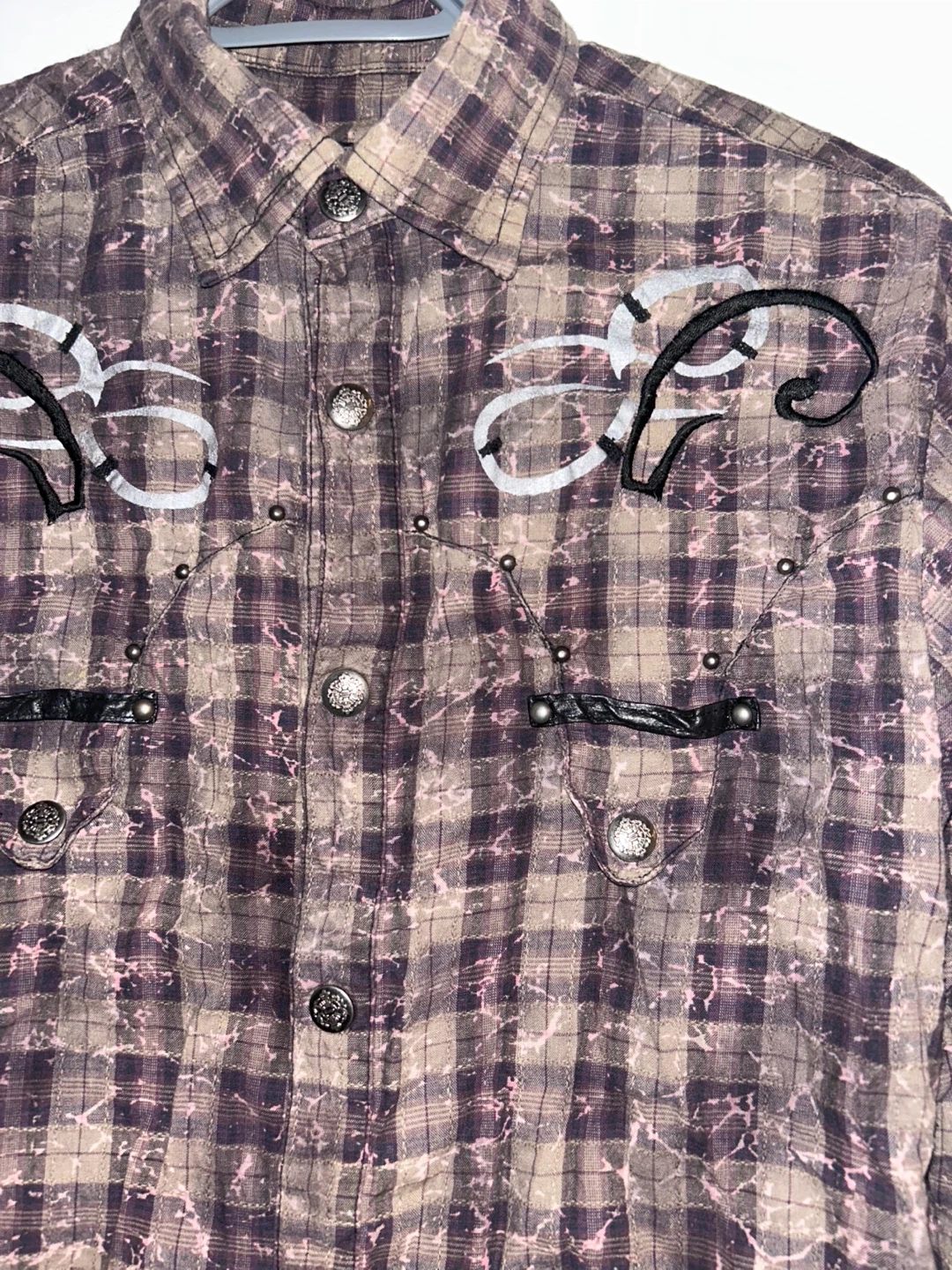 Unique vintage western-style shirt with detailed embroidery and stud accents.