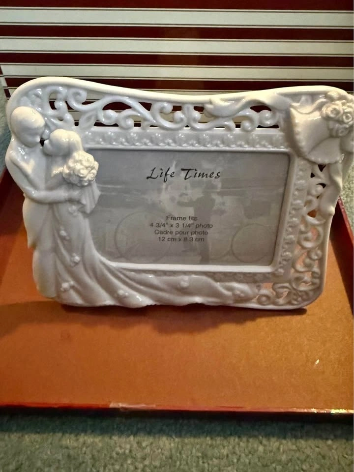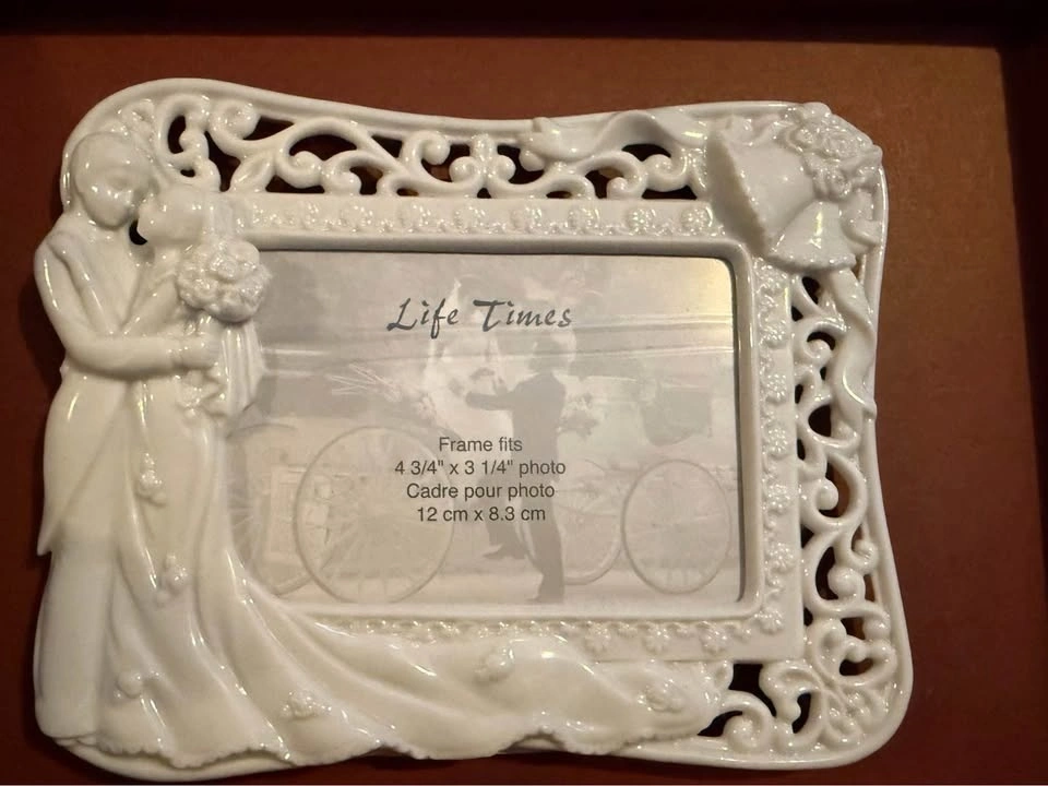 White ceramic wedding picture frame by Life Times. It fits a 4 3/4" x 3 1/4" (12 cm x 8.3 cm) photo.
