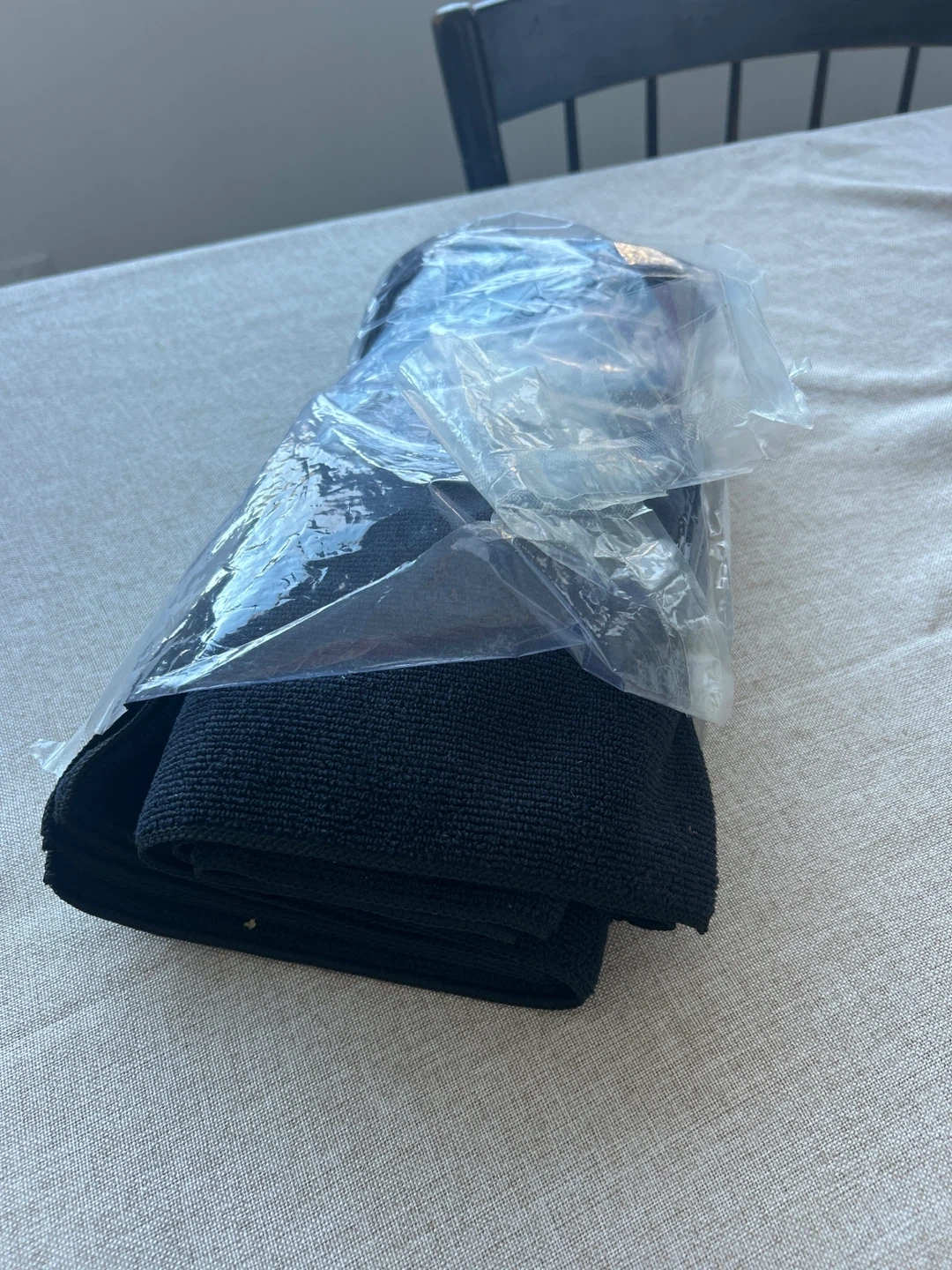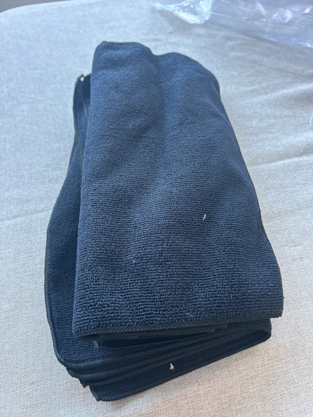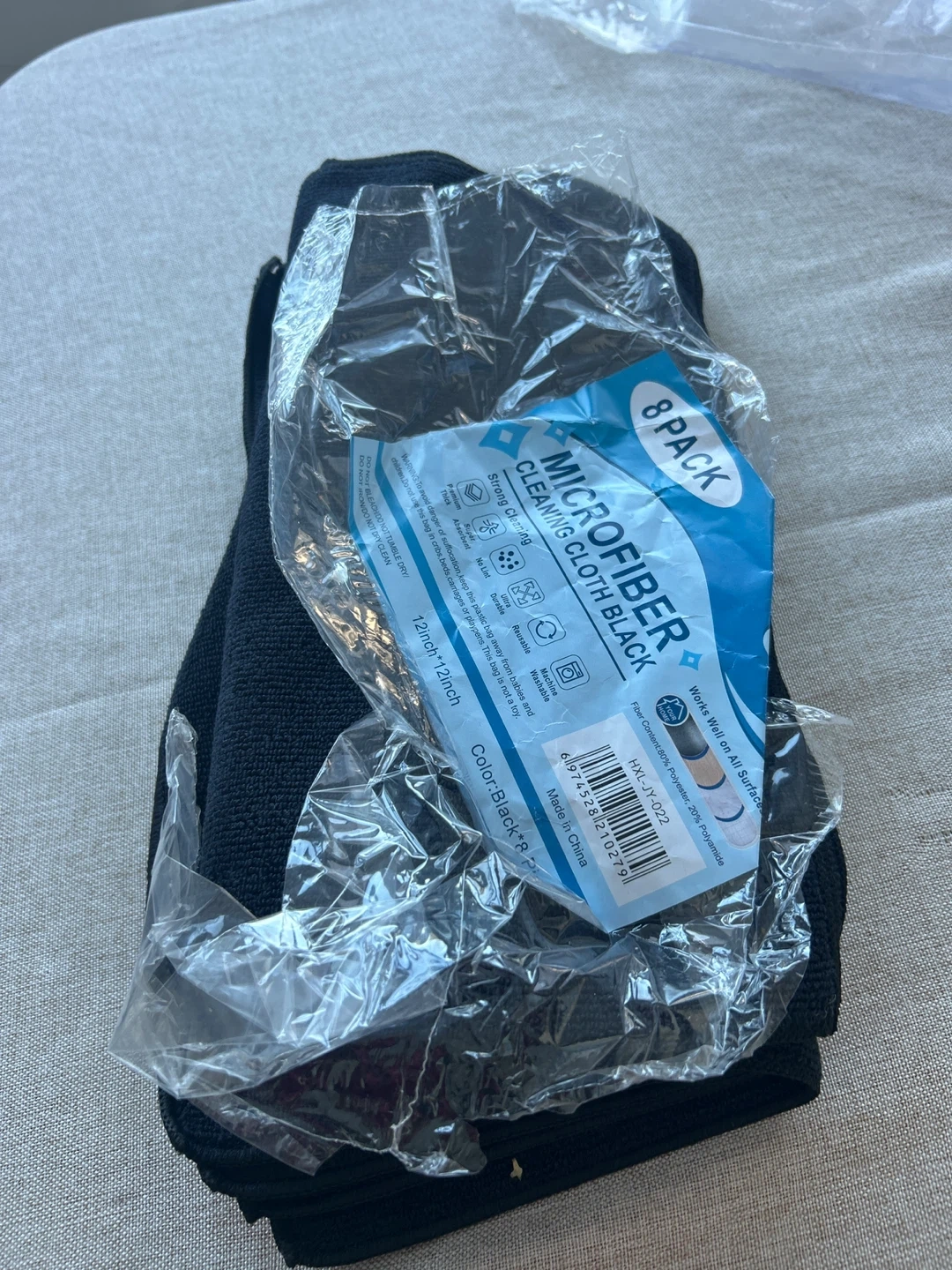 Set of 8 black microfiber cleaning cloths. Each cloth is 12"x12" and made from 80% Polyester, 20% Polyamide. These are great for all sorts of cleaning jobs around the house!