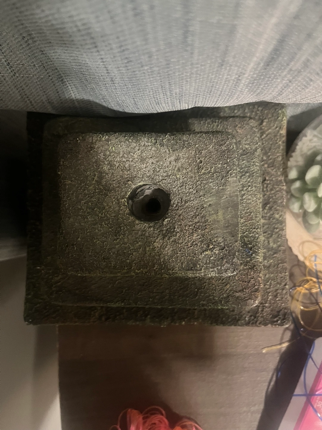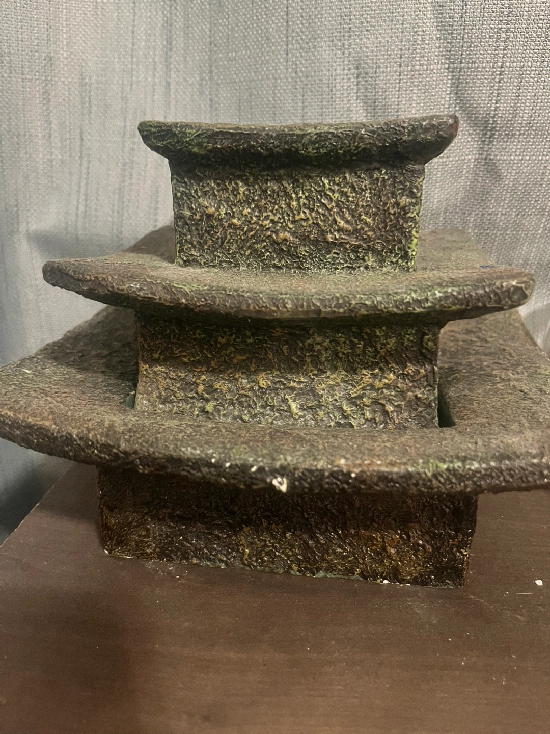 Small tabletop fountain. Three-tiered pagoda design. Dark greenish-brown colour. Looks like stone or resin. Includes pump. Perfect for small spaces.