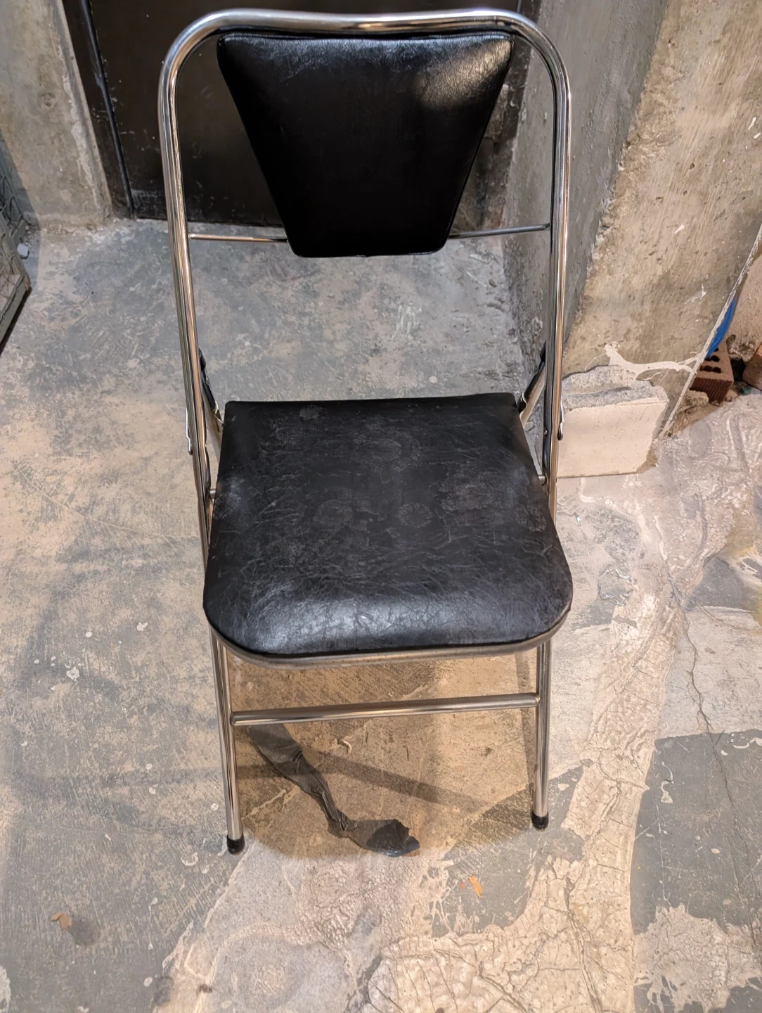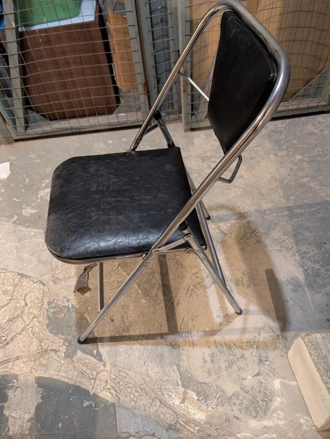 This is a black folding chair with a chrome metal frame. The seat and back are upholstered in a black faux leather material. It's a handy chair for extra seating!
