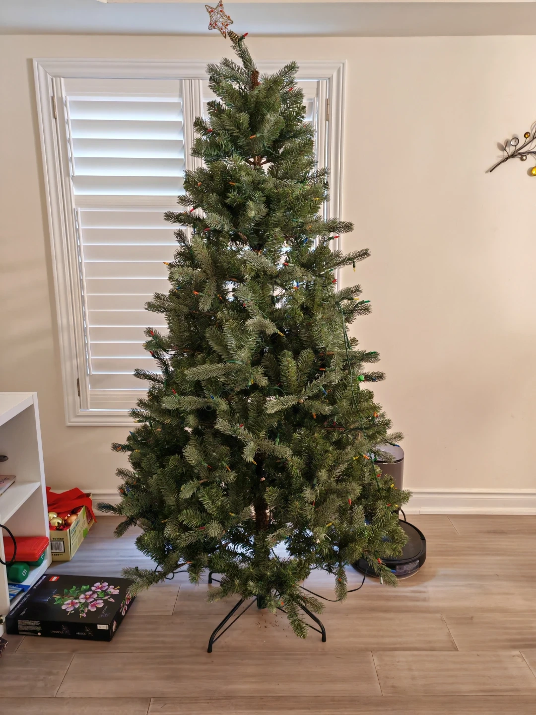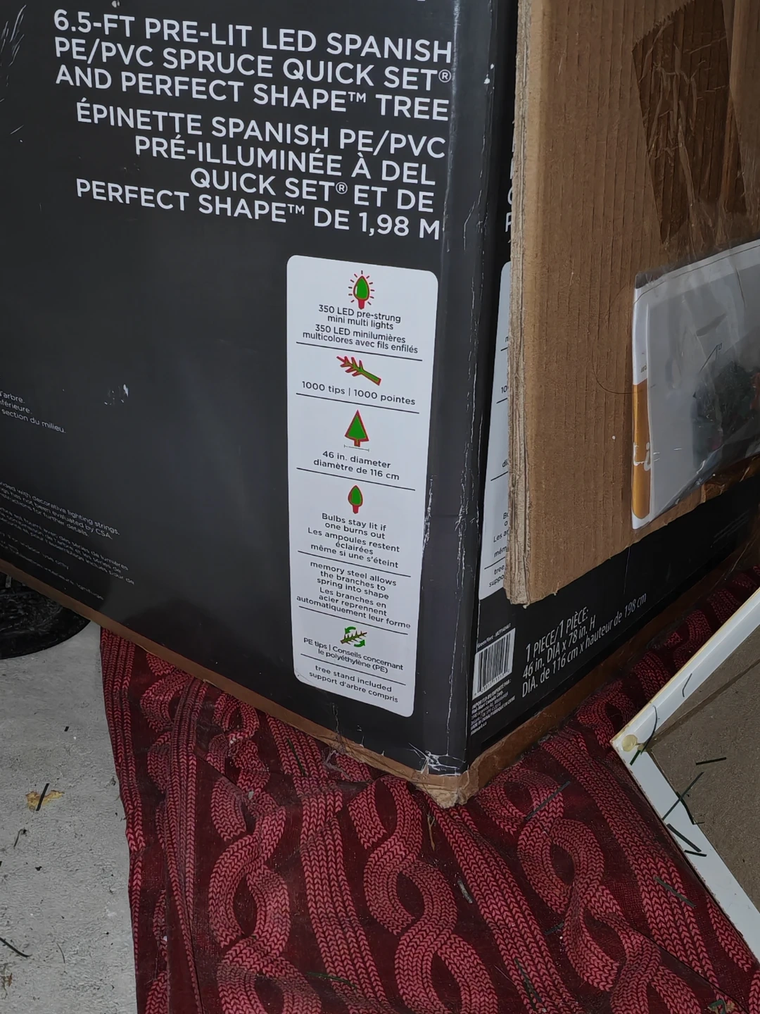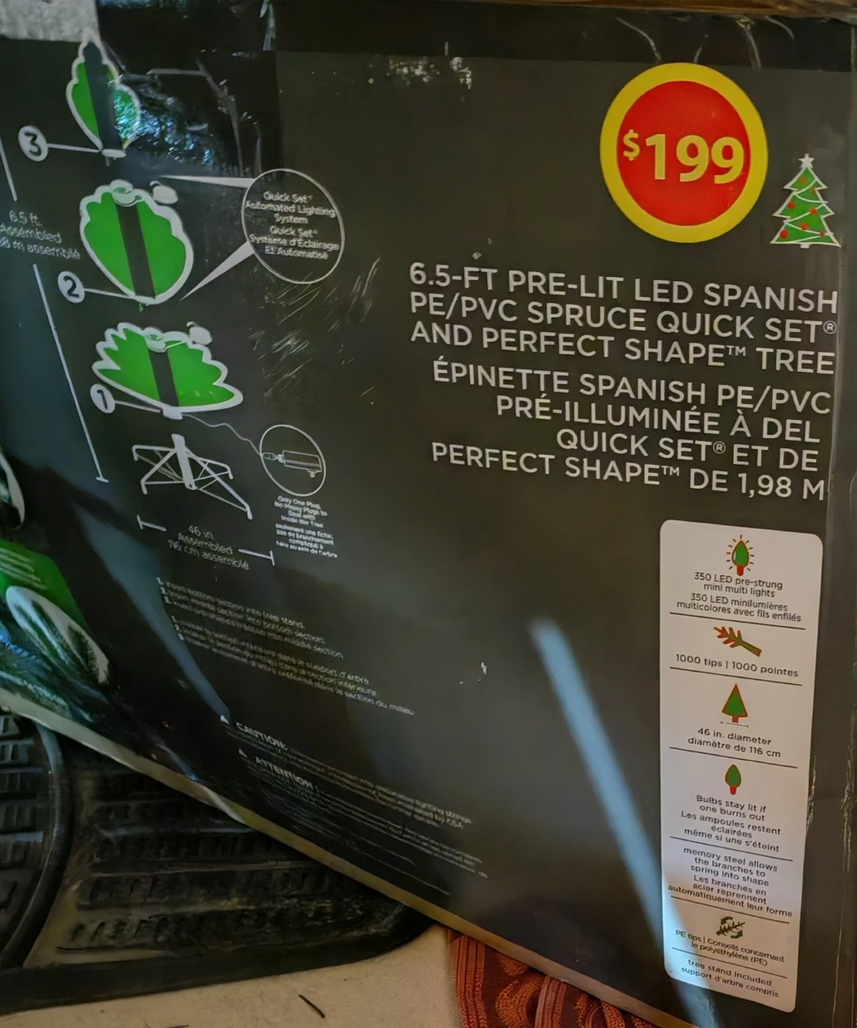This 6.5 ft pre-lit Christmas tree features 350 multi-colour LED lights and 1000 tips. It has a 46-inch diameter and the PE/PVC branches are flame-retardant and non-allergenic. The Quick Set technology allows for easy setup and the lights stay lit if one bulb burns out. Perfect for creating a festive holiday atmosphere!