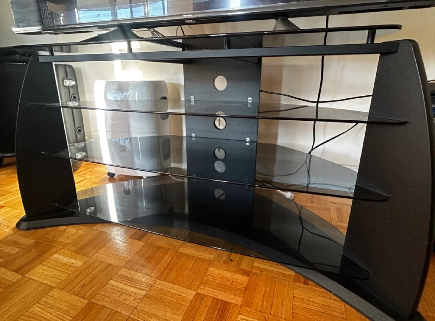 Modern black TV stand with tempered glass shelves. Strong and stylish design, perfect for a living room or bedroom. Features multiple glass levels for a TV, gaming consoles, cable box, or decorations. In good condition, clean and sturdy.