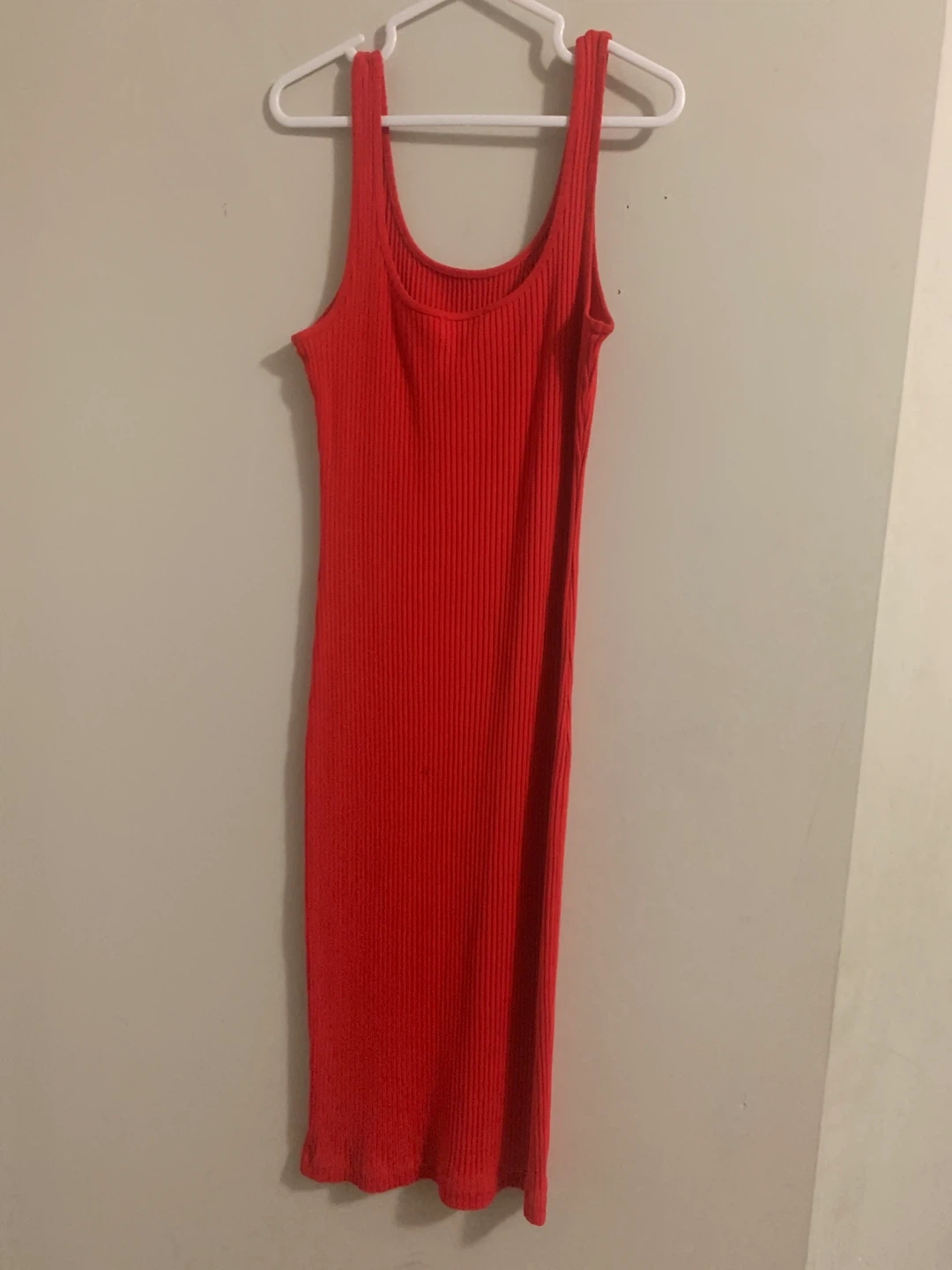 A cute red ribbed tank dress, perfect for summer! It's in great condition and ready for a new home. The material is soft and stretchy, making it super comfortable to wear. It's a versatile piece that can be dressed up or down, depending on the occasion