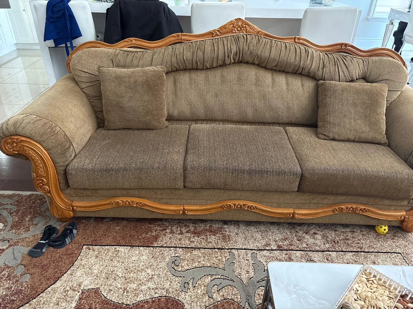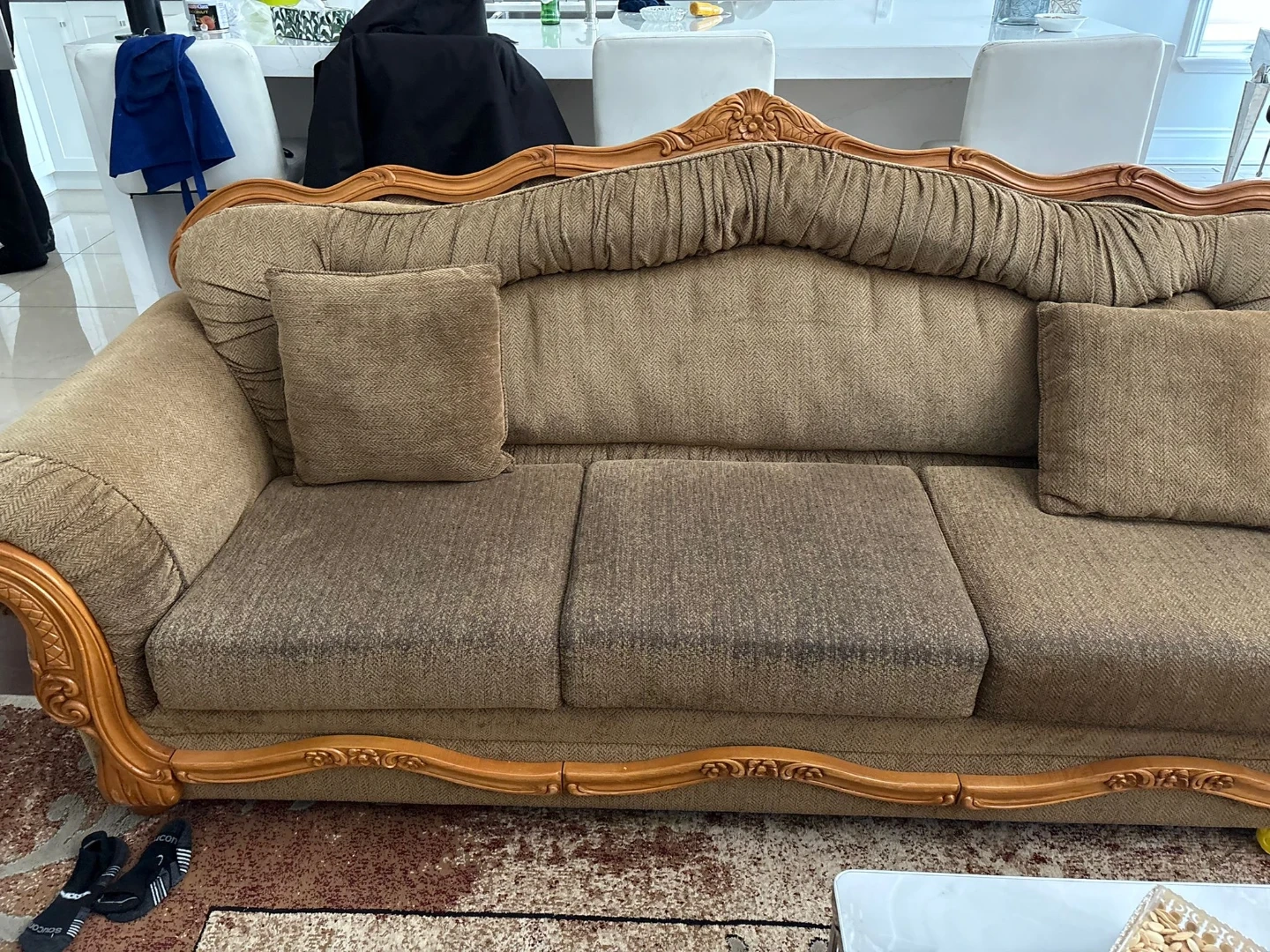 This elegant sofa features a comfortable cushioned seat and back with intricate tufting. It boasts ornate carved wood trim along the top and arms, adding a touch of classic style. The upholstery is a durable, textured brown fabric. Comes with two matching throw pillows. It's a substantial piece that would elevate any living space! 3 piece