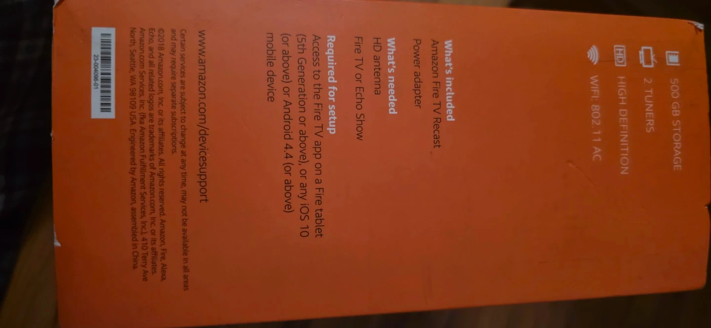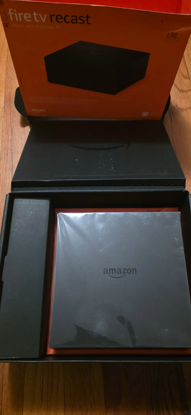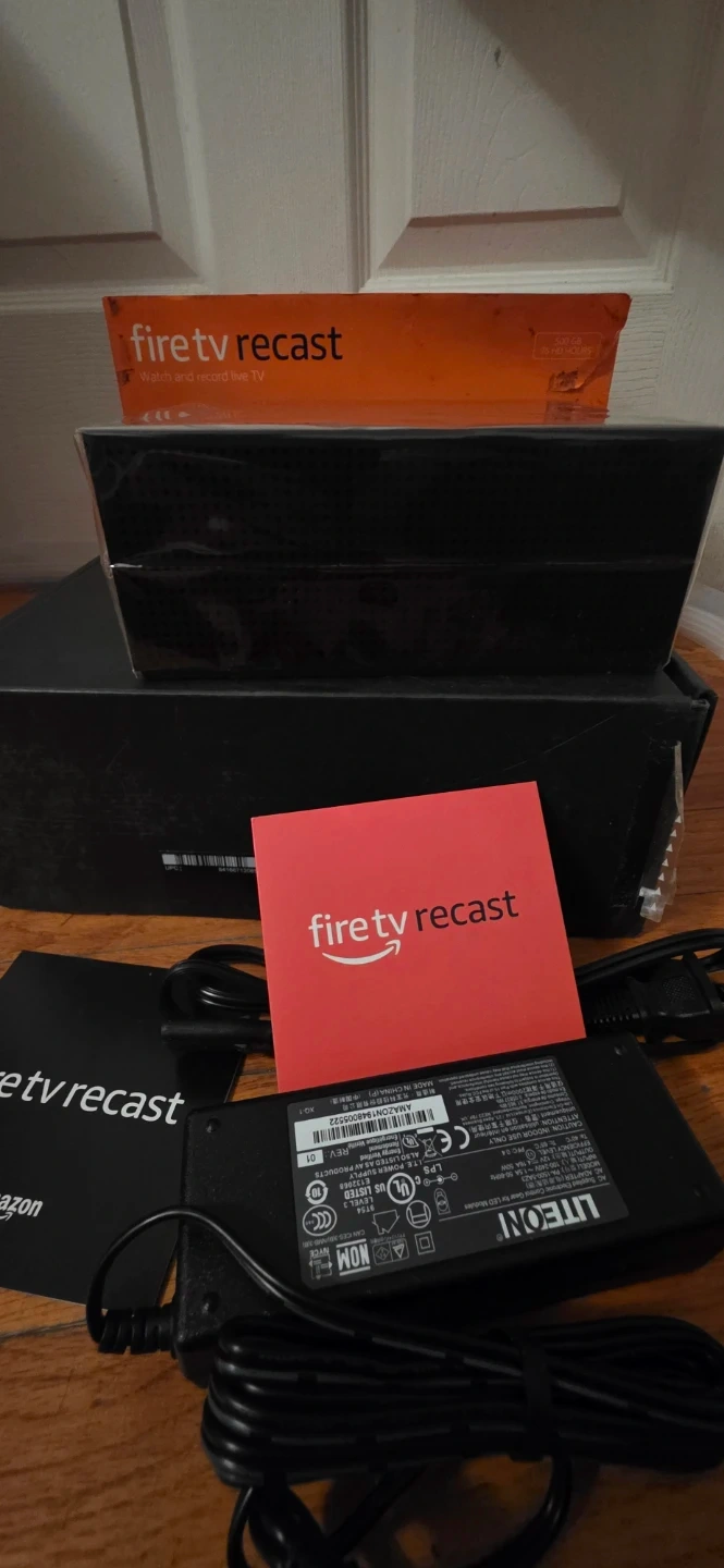 Amazon Fire TV Recast with 500 GB storage. Includes DVR functionality, two tuners, and WiFi 802.11ac. Comes with power adapter and original box.