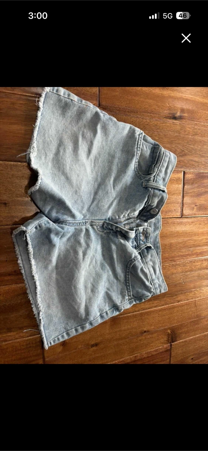 Light wash denim cut-off shorts with a frayed hem. These shorts have a classic five-pocket style. Made from durable denim.