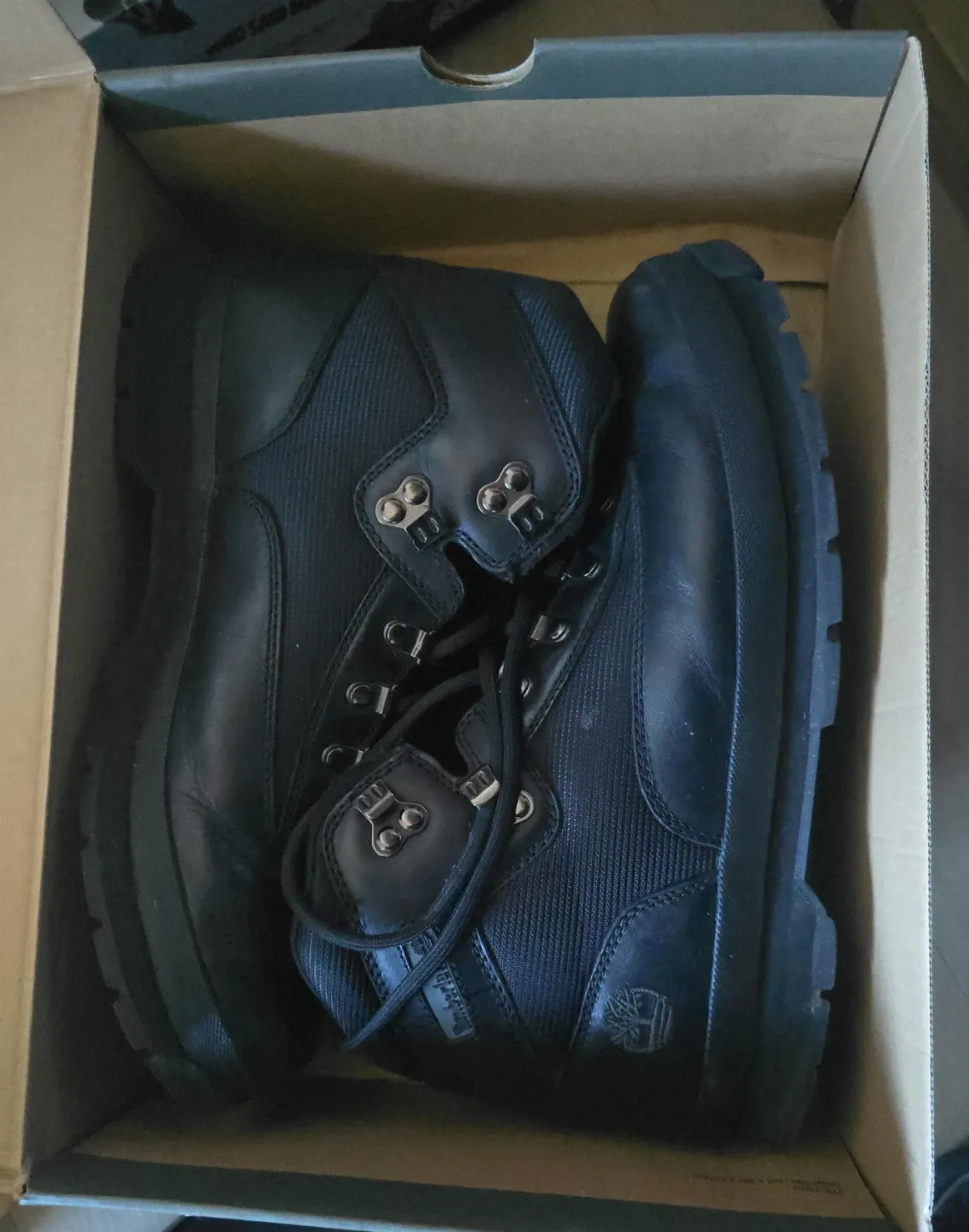 Classic black leather boots from Timberland. These lace-up boots feature a durable construction suitable for outdoor wear. Includes original box.