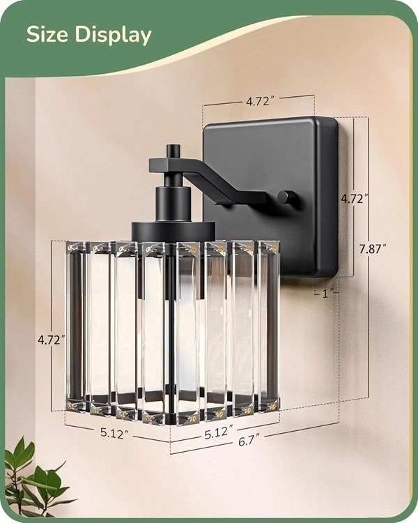 Featuring stunning transparent crystal shades with precision-cut surfaces, this bathroom vanity light casts a dazzling light. The black-painted metal surfaces resist rust and moisture, ensuring durability and a modern aesthetic. This 2-pack bath wall lighting is designed with ideal proportions for most bathroom mirrors; fixture size: 5.1"(D) x 7.7"(H); backplate: 4.7"(D) x 4.7"(H); crystal shade: 5.1"(D) x 5.1"(H). Compatible with standard E26 socket bulbs (bulbs not included), max up to 60W. Hardwired design, just connect the wires and mount the plate and lampshade. Easy to install with included mounting hardware. This bath wall mount sconce offers reversible installation: install it upward for bright, ambient illumination, or mount it downward for a pleasing mirror reflection. With its cutting crystal accents and black tones, the bath vanity lights add a clean and sophisticated look to any interior; perfect for bathroom, powder room, and dressing areas.