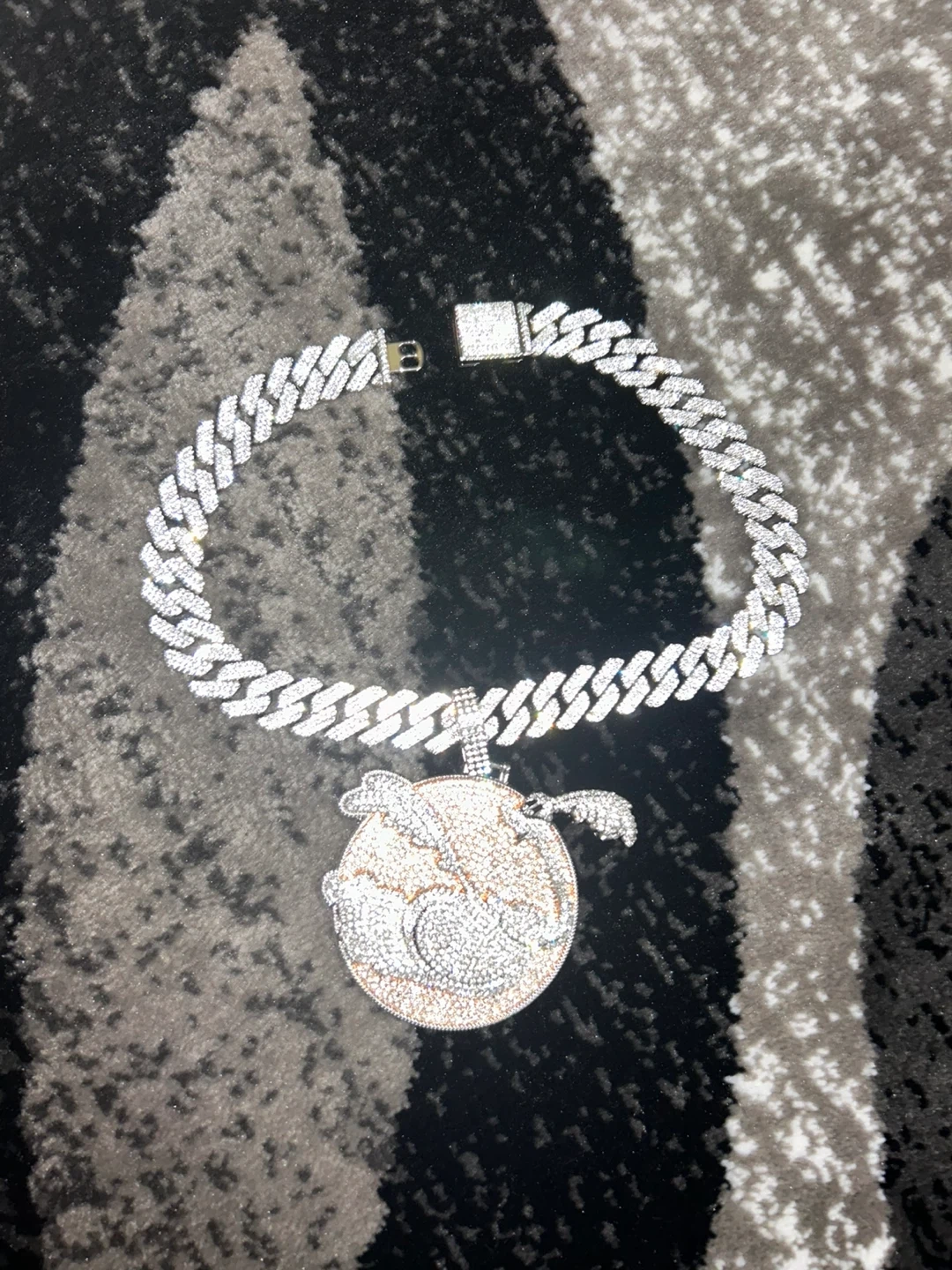 This is a blinged-out chain necklace featuring a unique Bunny charm. The chain and charm are covered in sparkling stones. It's a statement piece that's sure to turn heads!