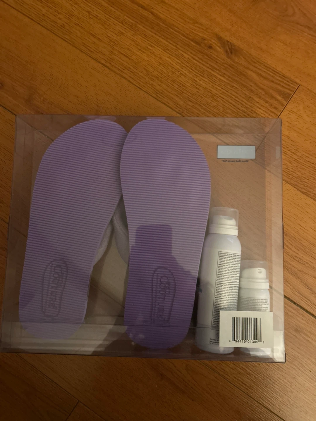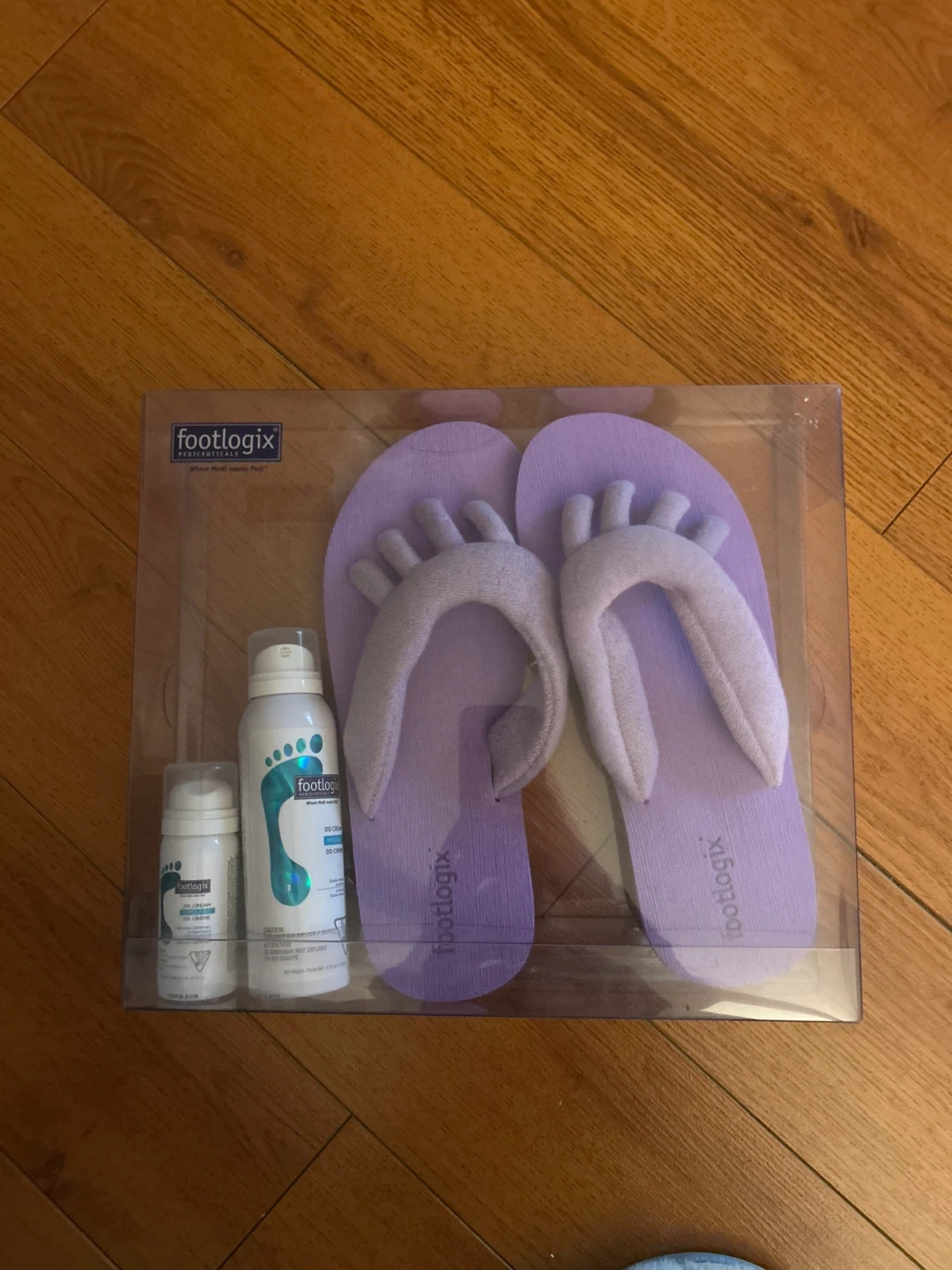 Selling a spa set (includes a pair of purple Footlogix flip-flops and two foot care products). The flip-flops are designed for comfort and feature the Footlogix logo. Included are a spray and a smaller bottle of foot treatment.