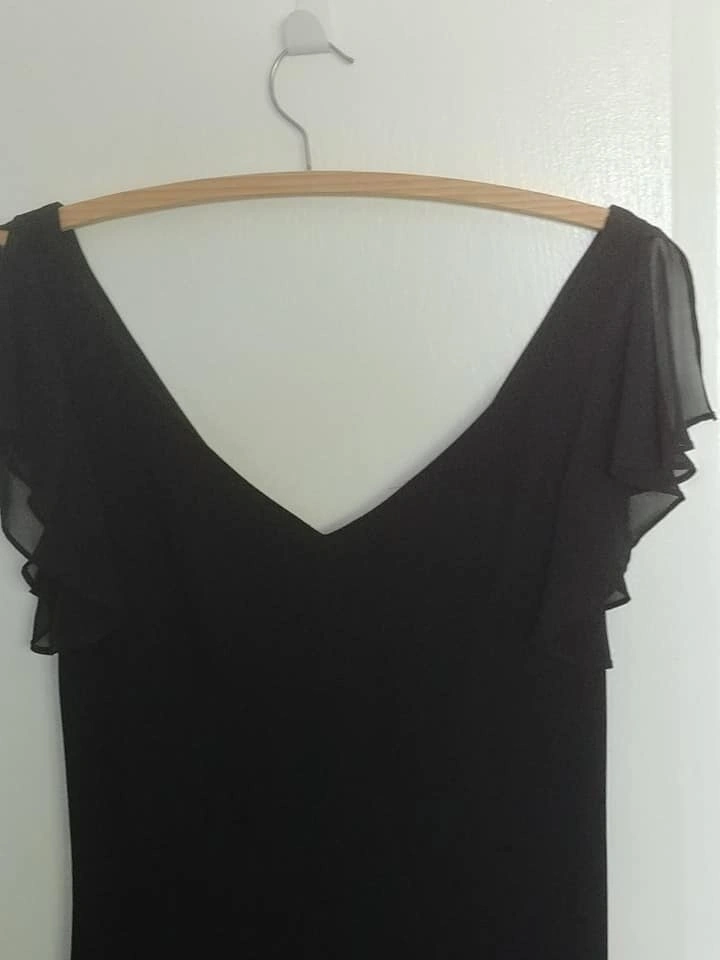 Beautiful black Bellesa cocktail dress, worn once, very elegant. Features pretty sheer chiffon flutter sleeves and sheer handkerchief details at the hemline. The lower half of the front is beaded from just below the waist to the hemline. This dress is stunning. Hidden side zipper.