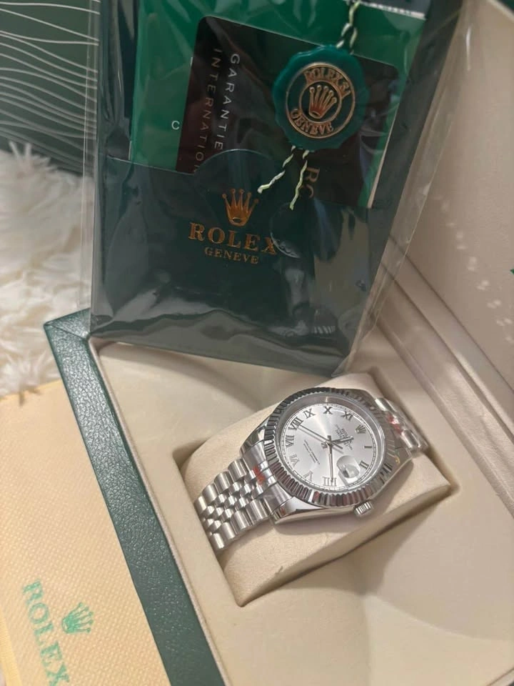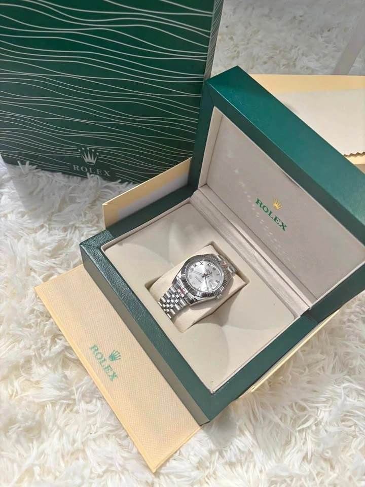The dial has Roman numerals and a date window at the 3 o’clock position with magnification. Crystal quartz powered timekeeping. Comes with the bags, boxes, invoice from the store, tags, card, as well as a link remover. Wearable to any formal events, or even for everyday use.