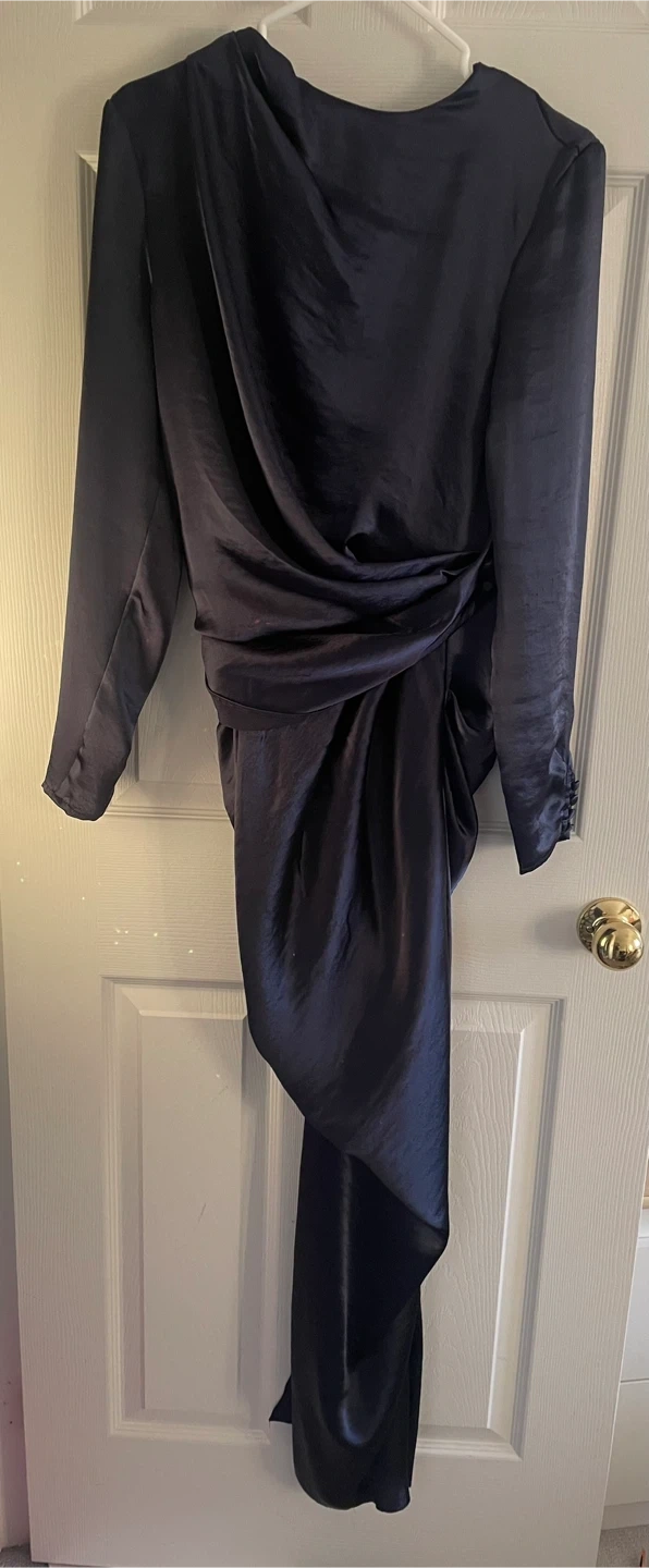 WORN ONCE ONLY. This navy blue satin dress from ASOS DESIGN features a stylish asymmetrical drape. It's a UK size 12, EU size 40, and US size 8. The material is satin and it's made in Romania. This dress is perfect for an evening event!